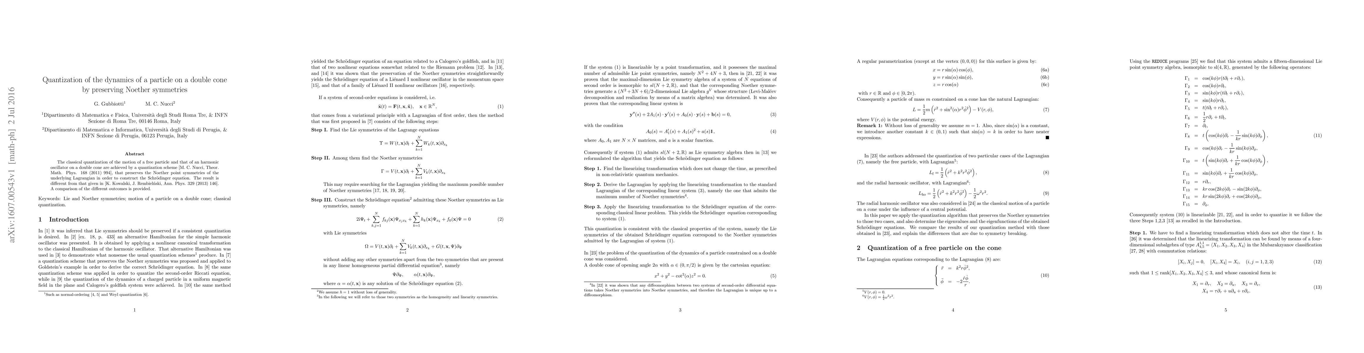 The classical quantization of the motion of a free particle and that of an harmonic oscillator on a double cone are achieved by a quantization scheme [M.C. Nucci, Theor. Math. Phys. 168 (2011) 994], that preserves the Noether point symmetries of the underlying Lagrangian in order to construct the Schroedinger equation. The result is different from that given in [K. Kowalski, J.Rembielnski, Ann. Phys. 329 (2013) 146]. A comparison of the different outcomes is provided.