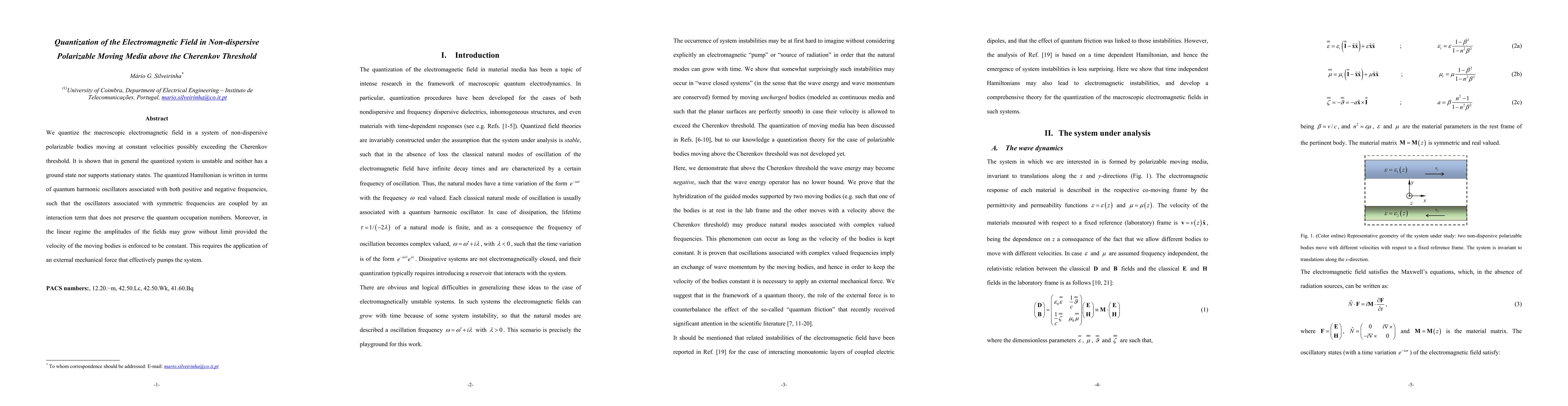 This paper quantizes the electromagnetic field in non-dispersive polarizable media moving faster than the Cherenkov threshold, revealing an inherent instability in the system that lacks a ground state or stationary states. The Hamiltonian involves quantum harmonic oscillators with both positive and negative frequencies, leading to unbounded field amplitude growth in the linear regime, necessitating an external mechanical force to maintain constant velocity.