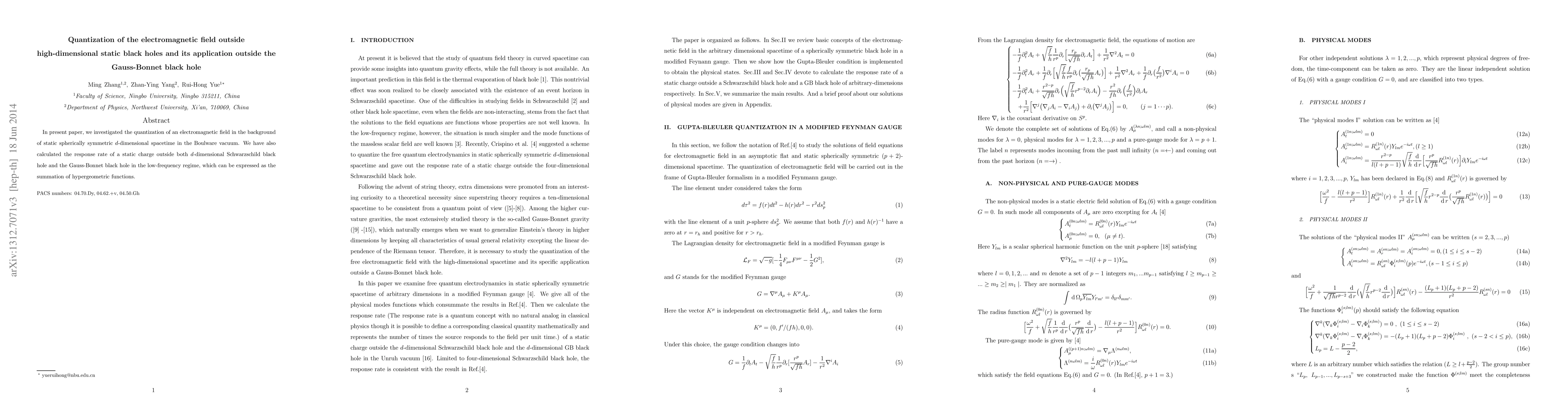 This paper quantizes the electromagnetic field in high-dimensional static black hole spacetimes, calculating the response rate of static charges outside both Schwarzschild and Gauss-Bonnet black holes, expressed as hypergeometric function summations.