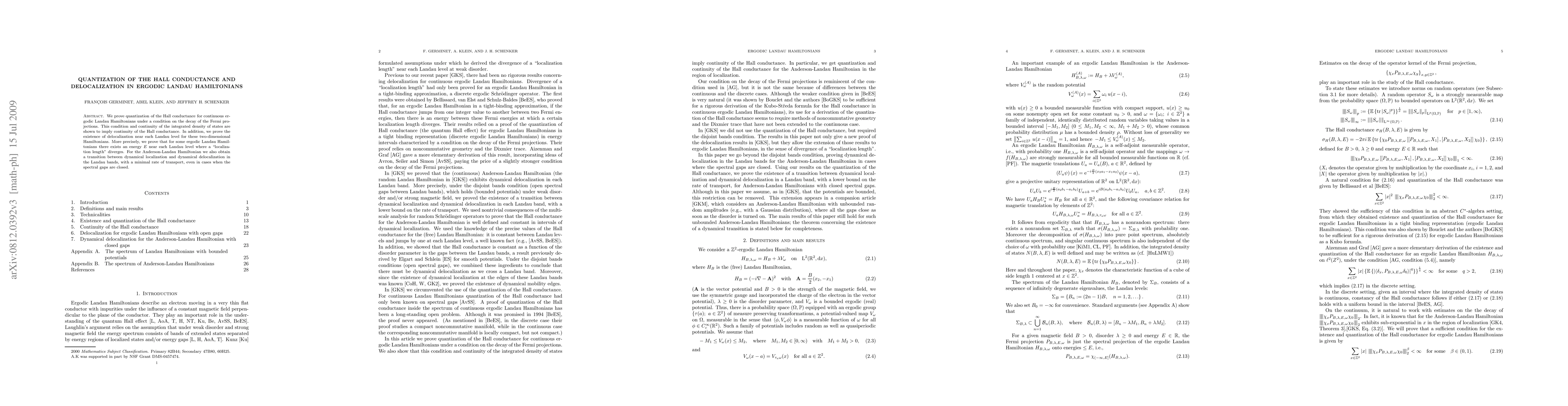This paper proves quantization of the Hall conductance for ergodic Landau Hamiltonians under specific conditions, and demonstrates continuity of the Hall conductance linked to the decay of Fermi projections. Additionally, it establishes delocalization near each Landau level, showing a transition between dynamical localization and delocalization in the Anderson-Landau Hamiltonian.