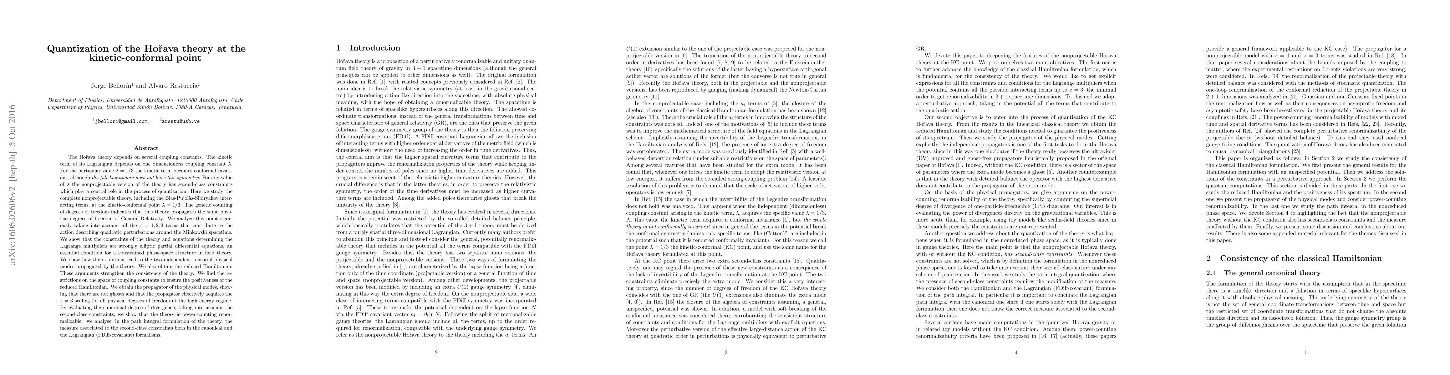 This paper quantizes the Horava theory at the kinetic-conformal point (lambda = 1/3), demonstrating that the theory propagates two independent tensorial physical modes akin to General Relativity. It shows the theory's constraints are strongly elliptic, ensuring a consistent constrained phase-space structure, and proves the theory is power-counting renormalizable.