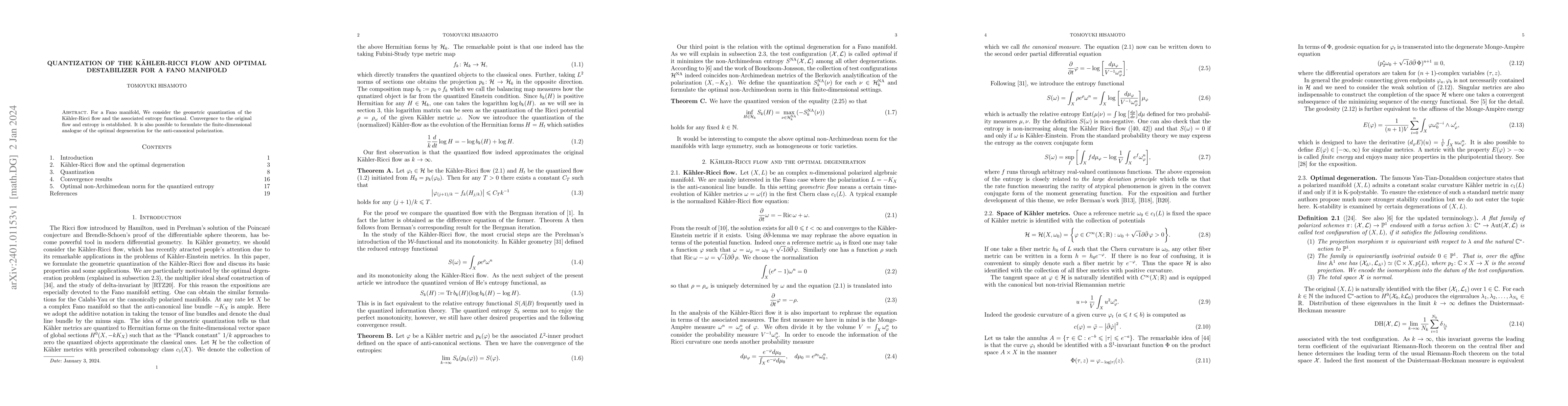 Summary: This paper quantizes the Kähler-Ricci flow for Fano manifolds and establishes its convergence to the original flow and entropy. It also introduces a finite-dimensional analogue for the optimal destabilizer of the anti-canonical polarization.