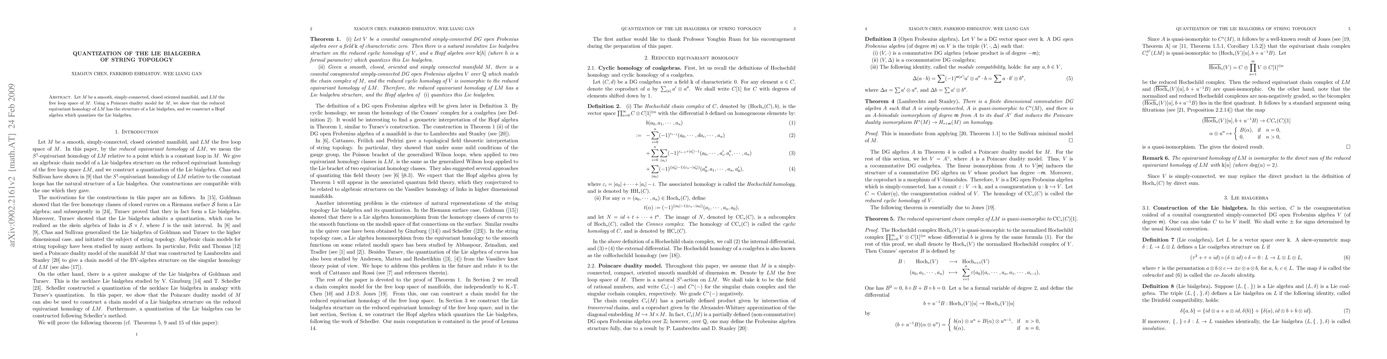 Let M be a smooth, simply-connected, closed oriented manifold, and LM the free loop space of M. Using a Poincare duality model for M, we show that the reduced equivariant homology of LM has the structure of a Lie bialgebra, and we construct a Hopf algebra which quantizes the Lie bialgebra.