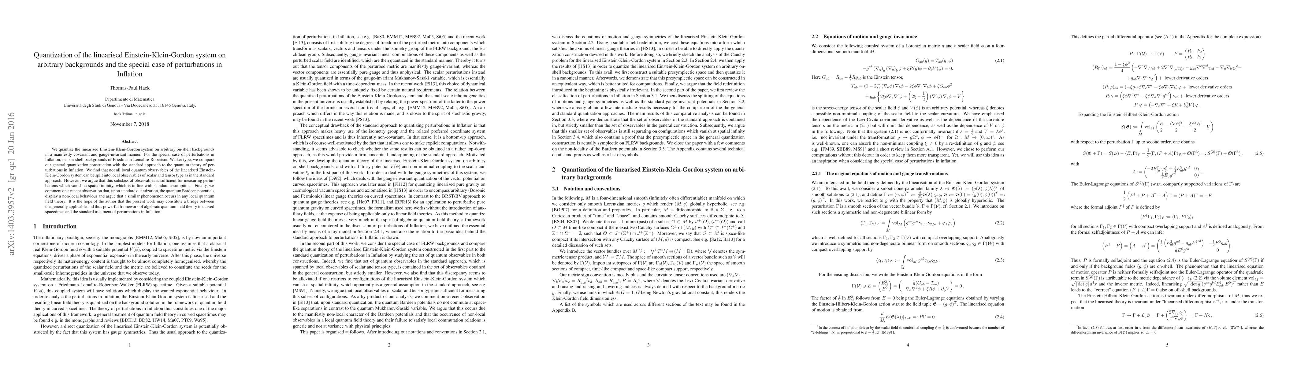 We quantize the linearised Einstein-Klein-Gordon system on arbitrary on-shell backgrounds in a manifestly covariant and gauge-invariant manner. For the special case of perturbations in Inflation, i.e. on-shell backgrounds of Friedmann-Lema\^itre-Robertson-Walker type, we compare our general quantization construction with the standard approach to the quantum theory of perturbations in Inflation. We find that not all local quantum observables of the linearised Einstein-Klein-Gordon system can be split into local observables of scalar and tensor type as in the standard approach. However, we argue that this subclass of observables is sufficient for measuring perturbations which vanish at spatial infinity, which is in line with standard assumptions. Finally, we comment on a recent observation that, upon standard quantization, the quantum Bardeen potentials display a non-local behaviour and argue that a similar phenomenon occurs in any local quantum field theory.