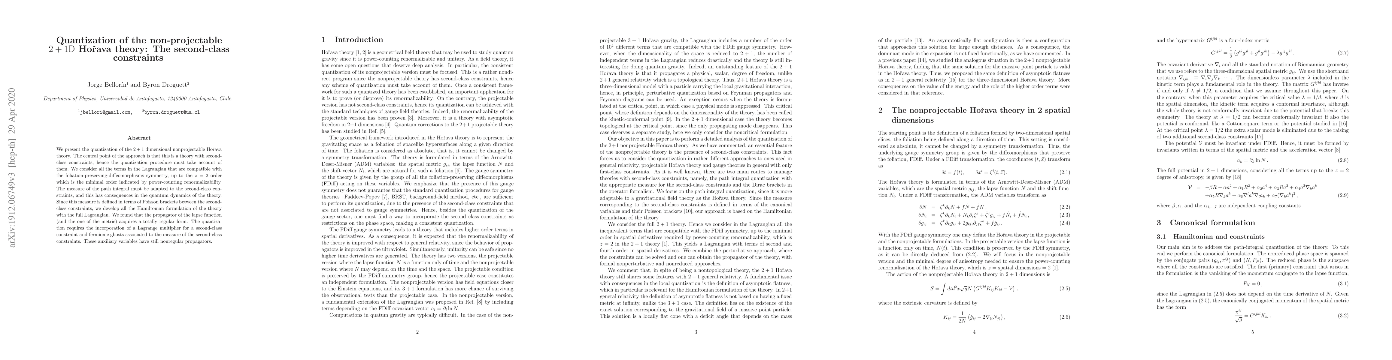 This paper quantizes the 2+1 dimensional nonprojectable Horava theory, focusing on its second-class constraints. The authors adapt the path integral measure to accommodate these constraints, leading to regular propagators for the lapse function and metric, and introduce auxiliary variables including a Lagrange multiplier and fermionic ghosts to manage the quantization process.