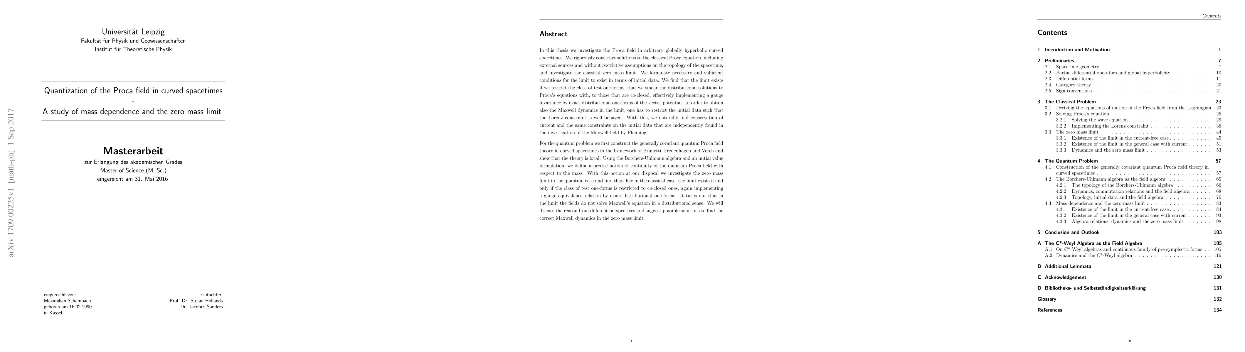 This thesis investigates the Proca field in curved spacetimes, finding a classical zero mass limit that exists under specific restrictions on test one-forms, and exploring the quantum case where this limit also holds but Maxwell's equation is not solved.