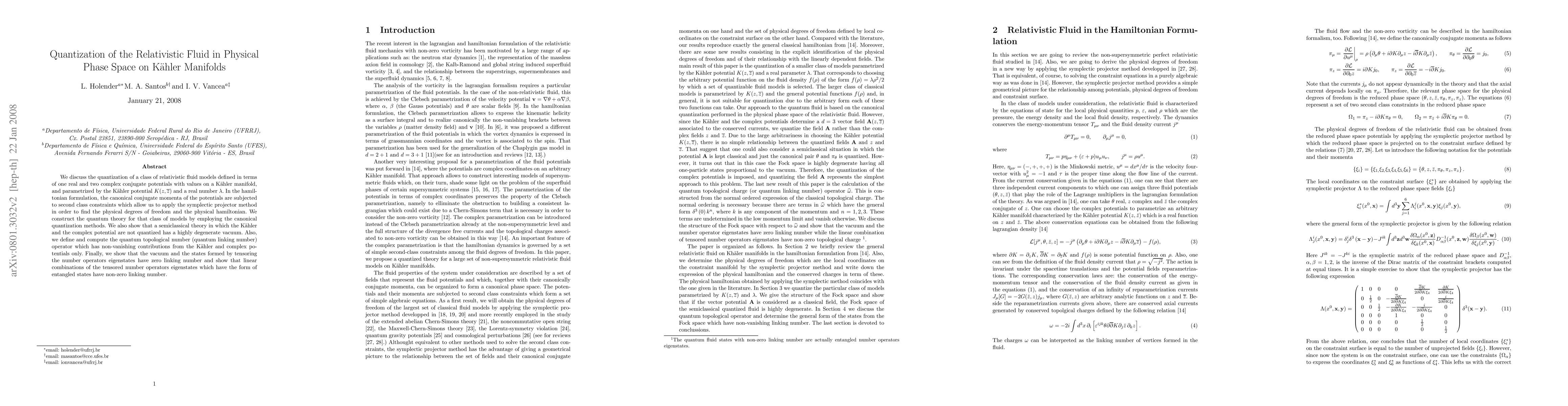 This paper quantizes relativistic fluid models on Kähler manifolds using canonical methods, revealing a highly degenerate vacuum in semiclassical theory. It introduces a quantum topological number operator with non-vanishing contributions from Kähler and complex potentials, showing that entangled states possess non-zero linking numbers.