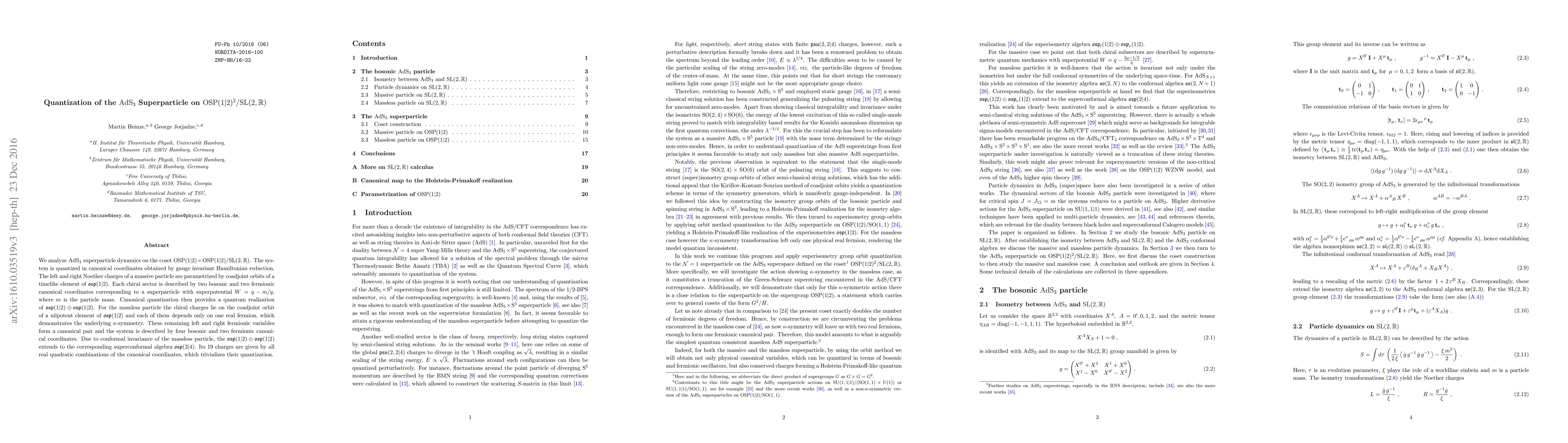 We analyze ${\rm AdS}_3$ superparticle dynamics on the coset ${\rm OSP}(1|2) \times {\rm OSP}(1|2)/{\rm SL}(2,\mathbb{R})$. The system is quantized in canonical coordinates obtained by gauge invariant Hamiltonian reduction. The left and right Noether charges of a massive particle are parametrized by coadjoint orbits of a timelike element of $\frak{osp}(1|2)$. Each chiral sector is described by two bosonic and two fermionic canonical coordinates corresponding to a superparticle with superpotential $W=q-m/q$, where $m$ is the particle mass. Canonical quantization then provides a quantum realization of $\frak{osp}(1|2)\oplus\frak{osp}(1|2)$. For the massless particle the chiral charges lie on the coadjoint orbit of a nilpotent element of $\frak{osp}(1|2)$ and each of them depends only on one real fermion, which demonstrates the underlying $\kappa$-symmetry. These remaining left and right fermionic variables form a canonical pair and the system is described by four bosonic and two fermionic canonical coordinates. Due to conformal invariance of the massless particle, the $\frak{osp}(1|2)\oplus\frak{osp} (1|2)$ extends to the corresponding superconformal algebra $\frak{osp}(2|4)$. Its 19 charges are given by all real quadratic combinations of the canonical coordinates, which trivializes their quantization.