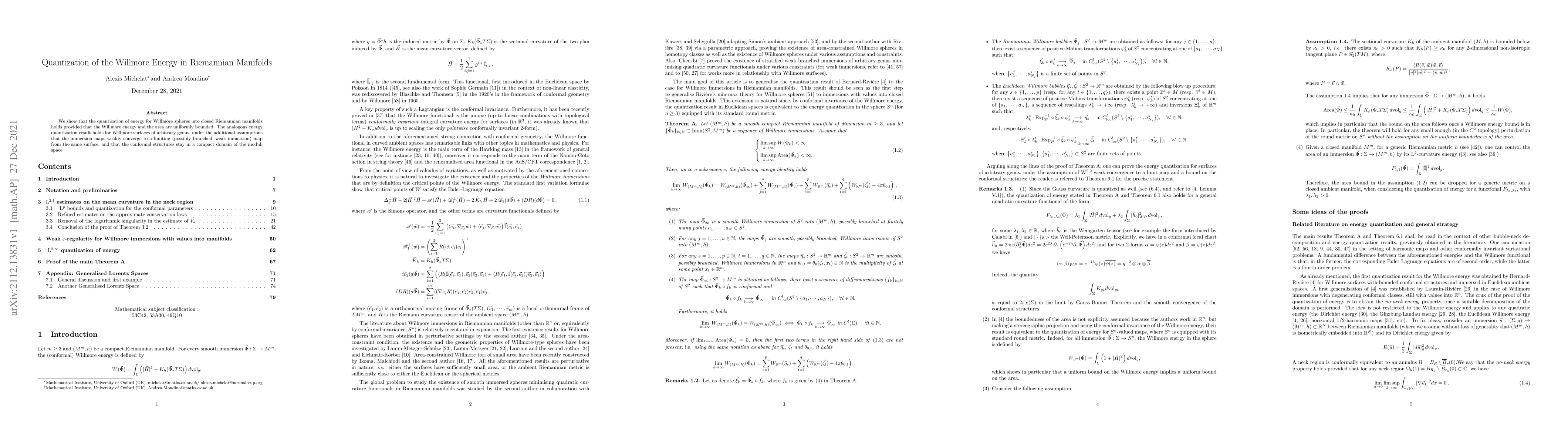 This paper demonstrates that the Willmore energy quantization applies to spheres in closed Riemannian manifolds with bounded energy and area. It extends this result to surfaces of any genus, provided immersion maps converge weakly and conformal structures remain in a compact moduli space.