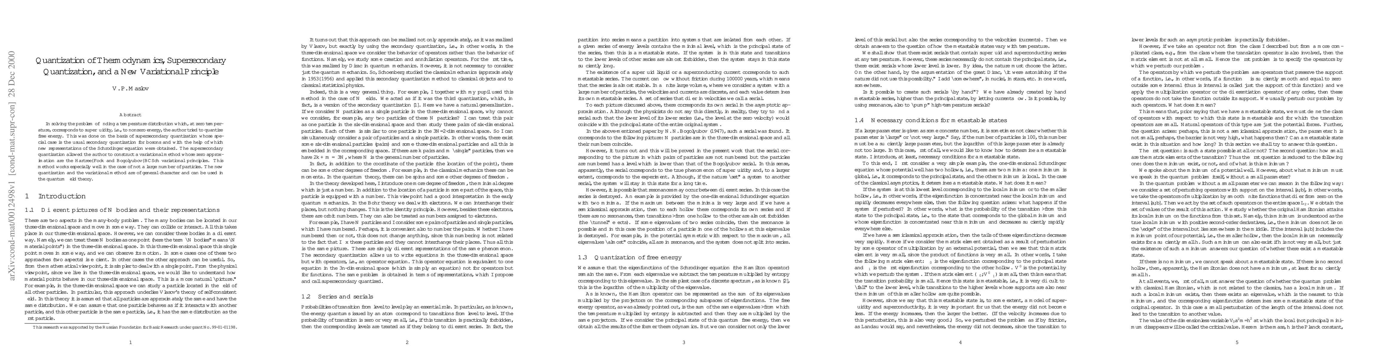 In solving the problem of finding a temperature distribution which, at zero temperature, corresponds to superfluidity, i.e., to nonzero energy, the author tried to quantize free energy. This was done on the basis of supersecondary quantization whose special case is the usual secondary quantization for bosons and with the help of which new representations of the Schr\"odinger equation were obtained. The supersecondary quantization allowed the author to construct a variational method whose zero approximation are the Hartree-Fock and Bogolyubov-BCSch variational principles. This method works especially well in the case of not a large number of particles. The new quantization and the variational method are of general character and can be used in the quantum field theory.
