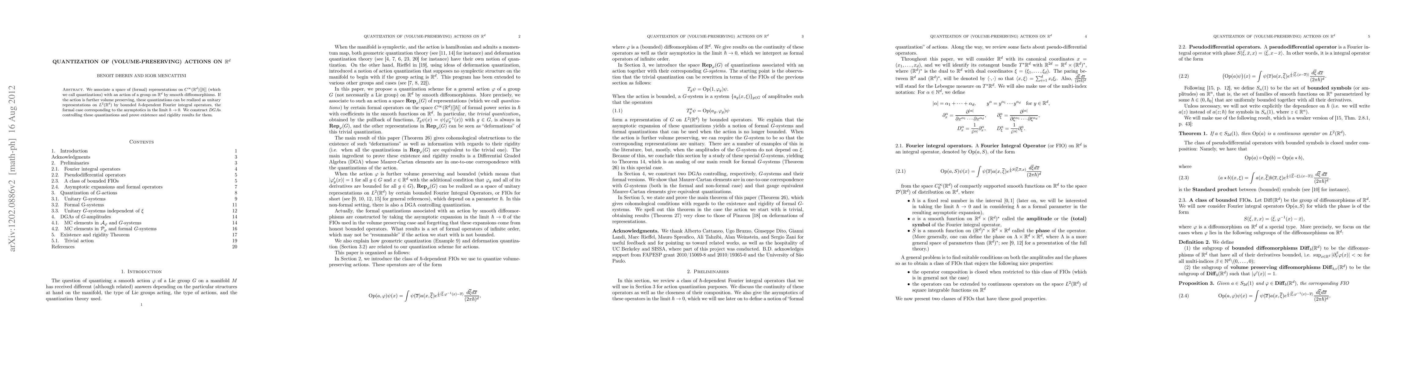 Researchers develop a framework to study volume-preserving actions on R^d using formal representations of smooth functions, exploring the connection between quantizations and unitary representations in the limit of small h.
