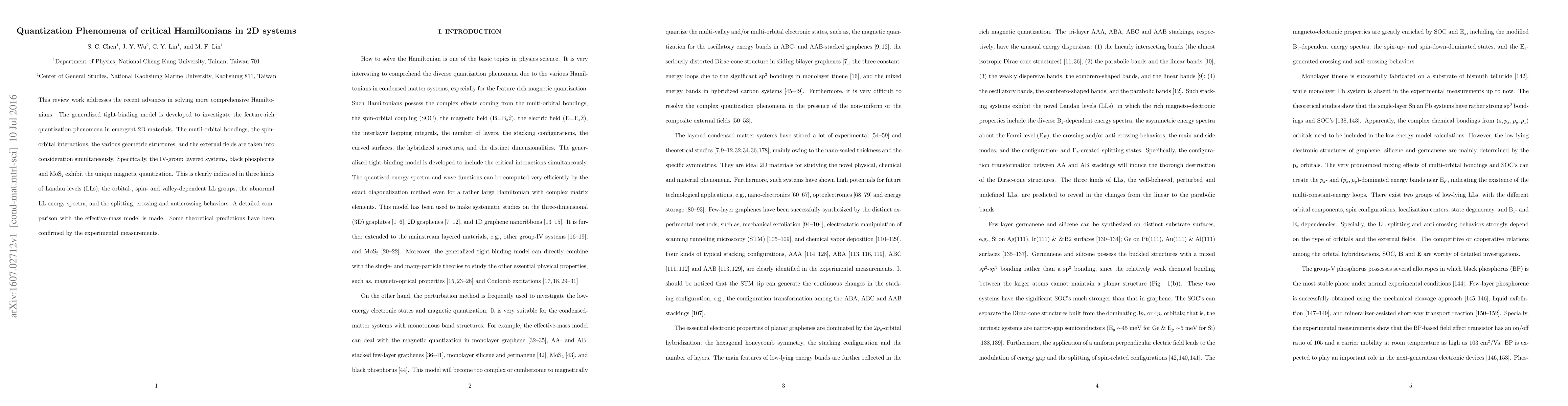 This review work addresses the recent advances in solving more comprehensive Hamiltonians. The generalized tight-binding model is developed to investigate the feature-rich quantization phenomena in emergent 2D materials. The mutli-orbital bondings, the spin-orbital interactions, the various geometric structures, and the external fields are taken into consideration simultaneously. Specifically, the IV-group layered systems, black phosphorus and MoS$_{2}$ exhibit the unique magnetic quantization. This is clearly indicated in three kinds of Landau levels (LLs), the orbital-, spin- and valley-dependent LL groups, the abnormal LL energy spectra, and the splitting, crossing and anticrossing behaviors. A detailed comparison with the effective-mass model is made. Some theoretical predictions have been confirmed by the experimental measurements.