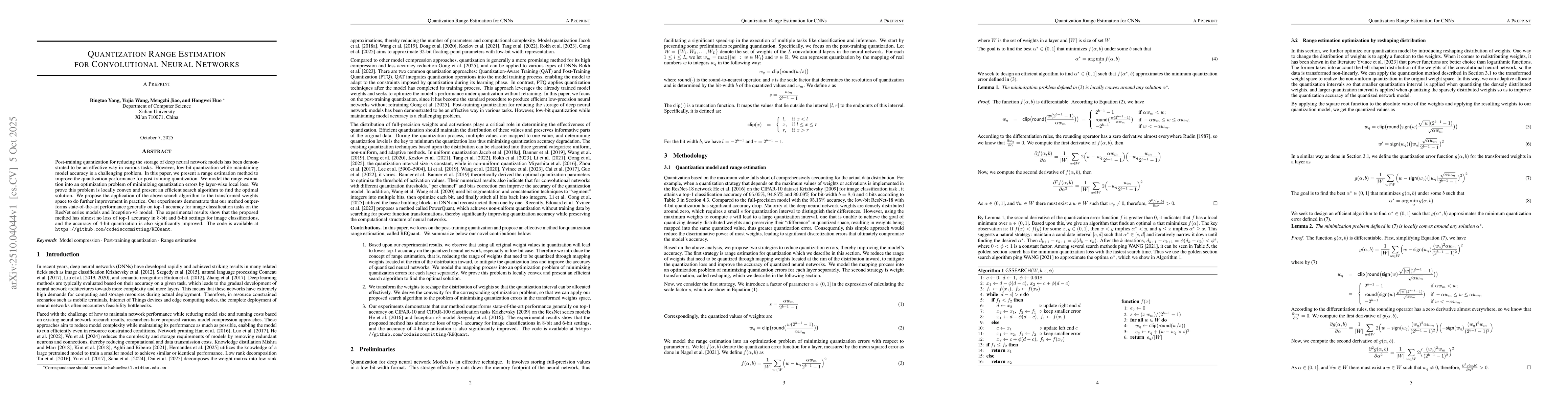 Post-training quantization for reducing the storage of deep neural network models has been demonstrated to be an effective way in various tasks. However, low-bit quantization while maintaining model accuracy is a challenging problem. In this paper, we present a range estimation method to improve the quantization performance for post-training quantization. We model the range estimation into an optimization problem of minimizing quantization errors by layer-wise local minima. We prove this problem is locally convex and present an efficient search algorithm to find the optimal solution. We propose the application of the above search algorithm to the transformed weights space to do further improvement in practice. Our experiments demonstrate that our method outperforms state-of-the-art performance generally on top-1 accuracy for image classification tasks on the ResNet series models and Inception-v3 model. The experimental results show that the proposed method has almost no loss of top-1 accuracy in 8-bit and 6-bit settings for image classifications, and the accuracy of 4-bit quantization is also significantly improved. The code is available at https://github.com/codeiscommitting/REQuant.