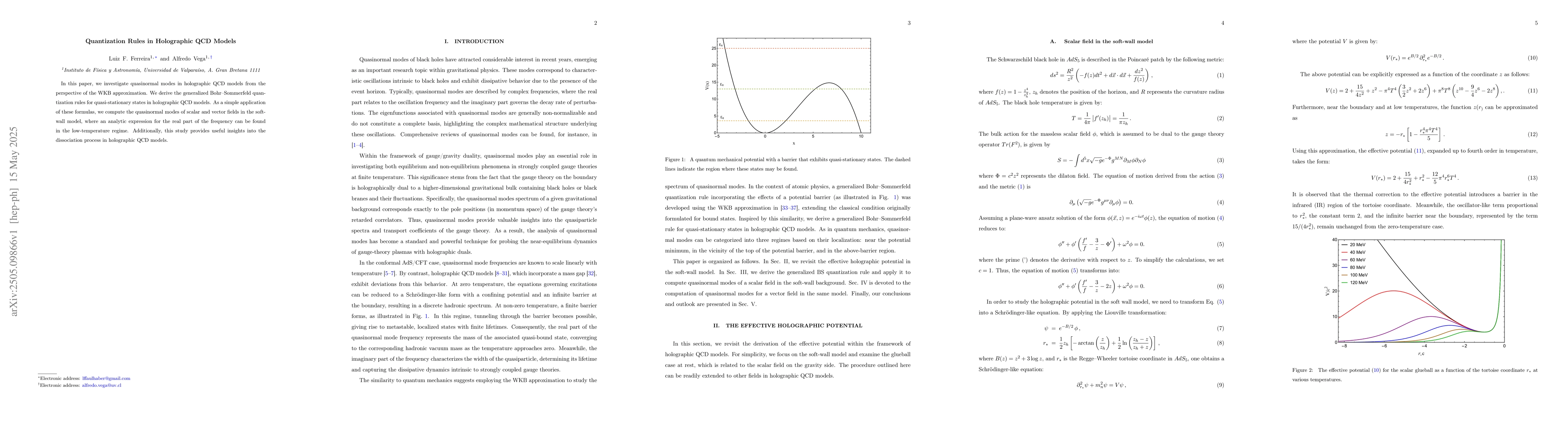 The paper presents generalized Bohr-Sommerfeld quantization rules for quasi-stationary states in holographic QCD models, along with an analytic expression for quasinormal modes' frequencies in the soft wall model's low temperature regime.