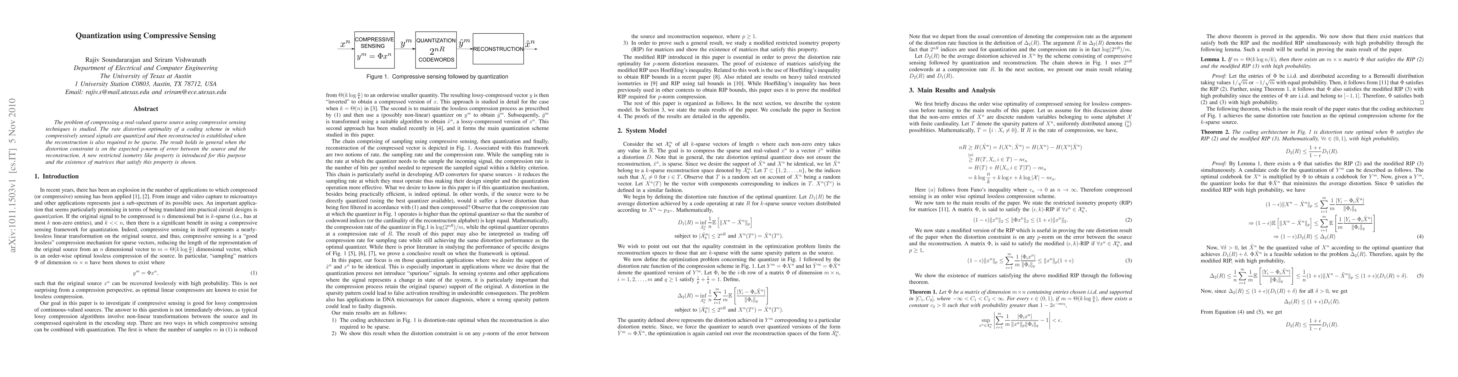 The problem of compressing a real-valued sparse source using compressive sensing techniques is studied. The rate distortion optimality of a coding scheme in which compressively sensed signals are quantized and then reconstructed is established when the reconstruction is also required to be sparse. The result holds in general when the distortion constraint is on the expected $p$-norm of error between the source and the reconstruction. A new restricted isometry like property is introduced for this purpose and the existence of matrices that satisfy this property is shown.