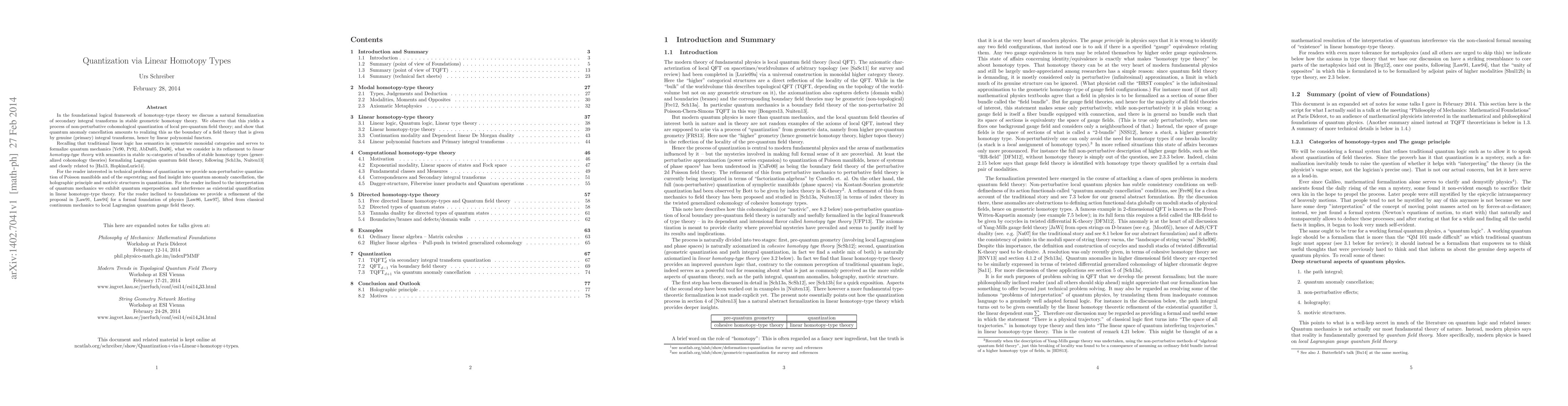 In the foundational logical framework of homotopy-type theory we discuss a natural formalization of secondary integral transforms in stable geometric homotopy theory. We observe that this yields a process of non-perturbative cohomological quantization of local pre-quantum field theory; and show that quantum anomaly cancellation amounts to realizing this as the boundary of a field theory that is given by genuine (primary) integral transforms, hence by linear polynomial functors. Recalling that traditional linear logic has semantics in symmetric monoidal categories and serves to formalize quantum mechanics, what we consider is its refinement to linear homotopy-type theory with semantics in stable infinity-categories of bundles of stable homotopy types (generalized cohomology theories) formalizing Lagrangian quantum field theory, following Nuiten and closely related to recent work by Haugseng and Hopkins-Lurie. For the reader interested in technical problems of quantization we provide non-perturbative quantization of Poisson manifolds and of the superstring; and find insight into quantum anomaly cancellation, the holographic principle and motivic structures in quantization. For the reader inclined to the interpretation of quantum mechanics we exhibit quantum superposition and interference as existential quantification in linear homotopy-type theory. For the reader inclined to foundations we provide a refinement of the proposal by Lawvere for a formal foundation of physics, lifted from classical continuum mechanics to local Lagrangian quantum gauge field theory.