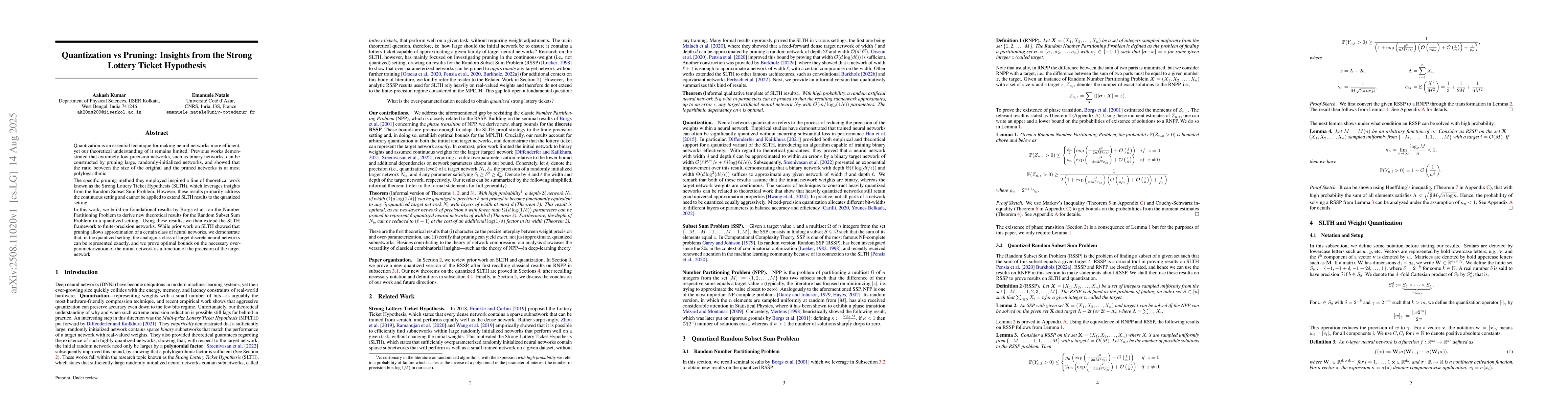 Quantization is an essential technique for making neural networks more efficient, yet our theoretical understanding of it remains limited. Previous works demonstrated that extremely low-precision networks, such as binary networks, can be constructed by pruning large, randomly-initialized networks, and showed that the ratio between the size of the original and the pruned networks is at most polylogarithmic. The specific pruning method they employed inspired a line of theoretical work known as the Strong Lottery Ticket Hypothesis (SLTH), which leverages insights from the Random Subset Sum Problem. However, these results primarily address the continuous setting and cannot be applied to extend SLTH results to the quantized setting. In this work, we build on foundational results by Borgs et al. on the Number Partitioning Problem to derive new theoretical results for the Random Subset Sum Problem in a quantized setting. Using these results, we then extend the SLTH framework to finite-precision networks. While prior work on SLTH showed that pruning allows approximation of a certain class of neural networks, we demonstrate that, in the quantized setting, the analogous class of target discrete neural networks can be represented exactly, and we prove optimal bounds on the necessary overparameterization of the initial network as a function of the precision of the target network.