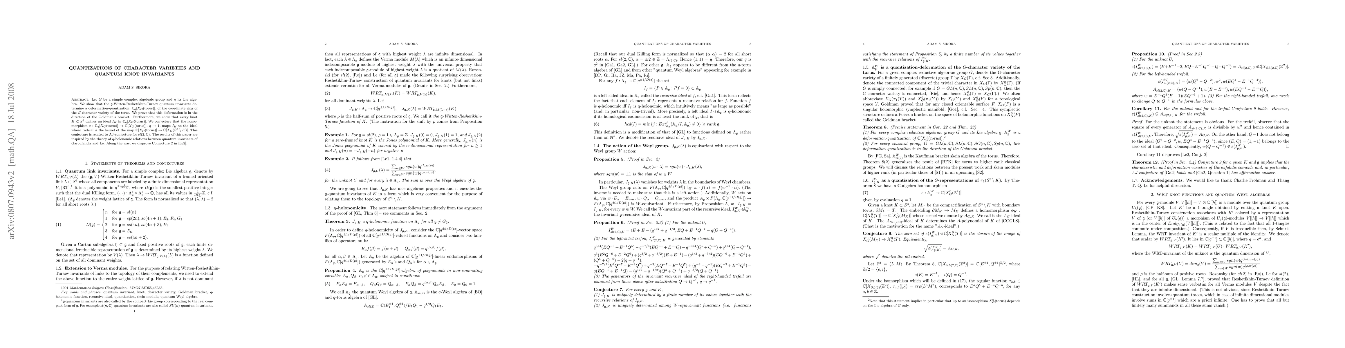 Let G be a simple complex algebraic group and g its Lie algebra. We show that the g-Witten-Reshetikhin-Turaev quantum invariants determine a deformation-quantization, C_q[X_G(torus)], of the coordinate ring of the G-character variety of the torus. We prove that this deformation is in the direction of the Goldman's bracket. Furthermore, we show that every knot K defines an ideal I_K in C_q[X_G(torus)]. We conjecture that the homomorphism C_q[X_G(torus)] -> C[X_G(torus)], q -> 1, maps I_K to the ideal whose radical is the kernel of the map C[X_G(torus)] -> C[X_G(S^3 K)]. This conjecture is related to AJ-conjecture for sl(2,\C). The results of this paper are inspired by the theory of q-holonomic relations between quantum invariants of Garoufalidis and Le. Along the way, we disprove Conjecture 2 in Le's "The Colored Jones and the A-polynomial of Two-Bridge knots".