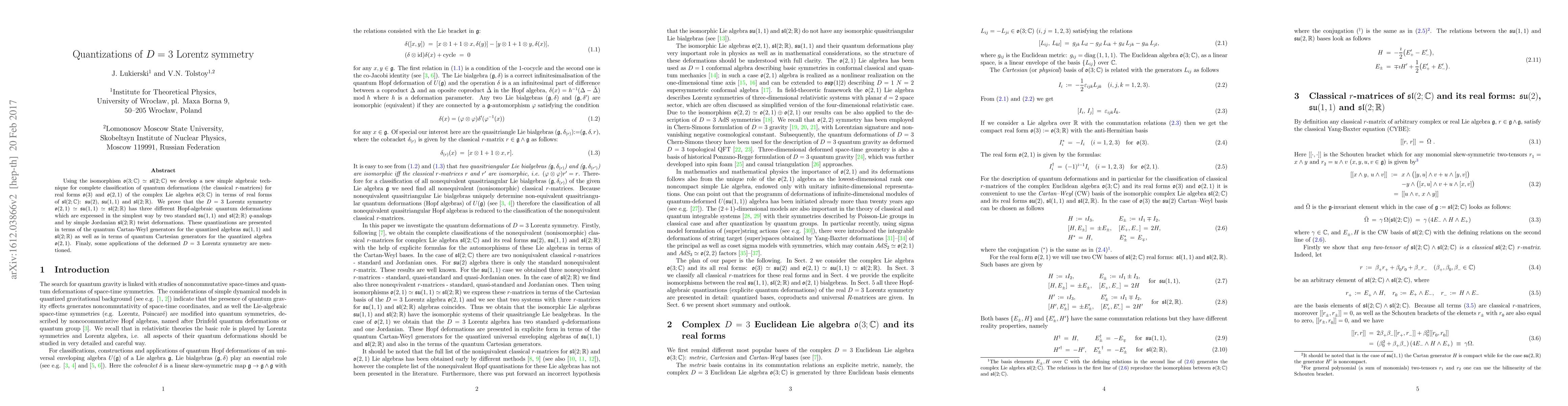 Using the isomorphism $\mathfrak{o}(3;\mathbb{C})\simeq\mathfrak{sl}(2;\mathbb{C})$ we develop a new simple algebraic technique for complete classification of quantum deformations (the classical $r$-matrices) for real forms $\mathfrak{o}(3)$ and $\mathfrak{o}(2,1)$ of the complex Lie algebra $\mathfrak{o}(3;\mathbb{C})$ in terms of real forms of $\mathfrak{sl}(2;\mathbb{C})$: $\mathfrak{su}(2)$, $\mathfrak{su}(1,1)$ and $\mathfrak{sl}(2;\mathbb{R})$. We prove that the $D=3$ Lorentz symmetry $\mathfrak{o}(2,1)\simeq\mathfrak{su}(1,1)\simeq\mathfrak{sl}(2;\mathbb{R})$ has three different Hopf-algebraic quantum deformations which are expressed in the simplest way by two standard $\mathfrak{su}(1,1)$ and $\mathfrak{sl}(2;\mathbb{R})$ $q$-analogs and by simple Jordanian $\mathfrak{sl}(2;\mathbb{R})$ twist deformations. These quantizations are presented in terms of the quantum Cartan-Weyl generators for the quantized algebras $\mathfrak{su}(1,1)$ and $\mathfrak{sl}(2;\mathbb{R})$ as well as in terms of quantum Cartesian generators for the quantized algebra $\mathfrak{o}(2,1)$. Finaly, some applications of the deformed $D=3$ Lorentz symmetry are mentioned.