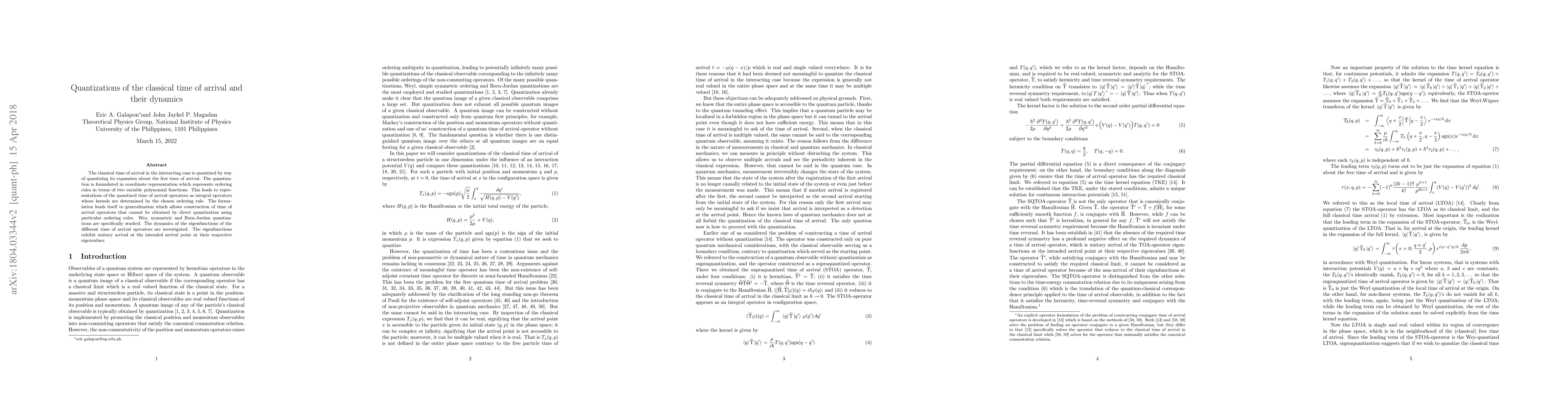 This paper quantizes the classical time of arrival in the interacting case through an expansion about the free time of arrival, formulated in coordinate representation. The study explores Wey, symmetric, and Born-Jordan quantizations, examining the dynamics of eigenfunctions that demonstrate unitary arrival at their respective eigenvalues.