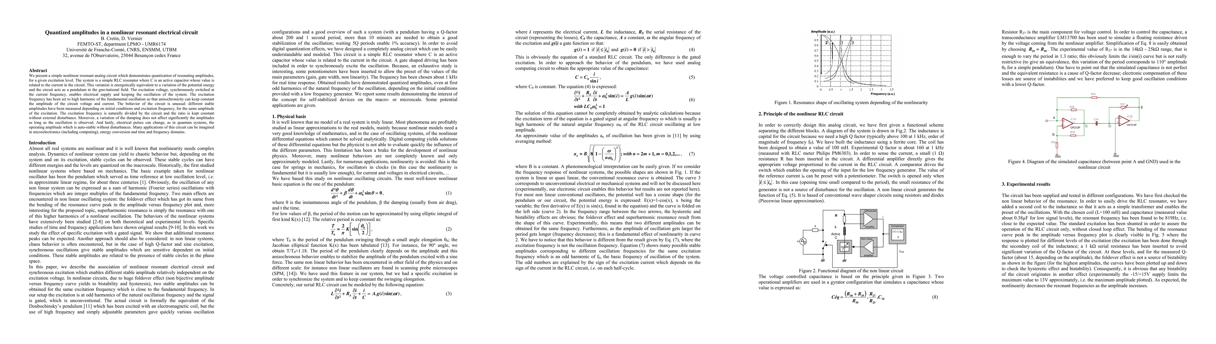 We present a simple nonlinear resonant analog circuit which demonstrates quantization of resonating amplitudes, for a given excitation level. The system is a simple RLC resonator where C is an active capacitor whose value is related to the current in the circuit. This variation is energetically equivalent to a variation of the potential energy and the circuit acts as a pendulum in the gravitational field. The excitation voltage, synchronously switched at the current frequency, enables electrical supply and keeping the oscillation of the system. The excitation frequency has been set to high harmonic of the fundamental oscillation so that anisochronicity can keep constant the amplitude of the circuit voltage and current. The behavior of the circuit is unusual: different stable amplitudes have been measured depending on initial conditions and excitation frequency, for the same amplitude of the excitation. The excitation frequency is naturally divided by the circuit and the ratio is kept constant without external disturbance. Moreover, a variation of the dumping does not affect significantly the amplitudes as long as the oscillation is observed. And lastly, electrical pulses can change, as in quantum systems, the operating amplitude which is auto-stable without disturbances. Many applications of this circuit can be imagined in microelectronics (including computing), energy conversion and time and frequency domains.
