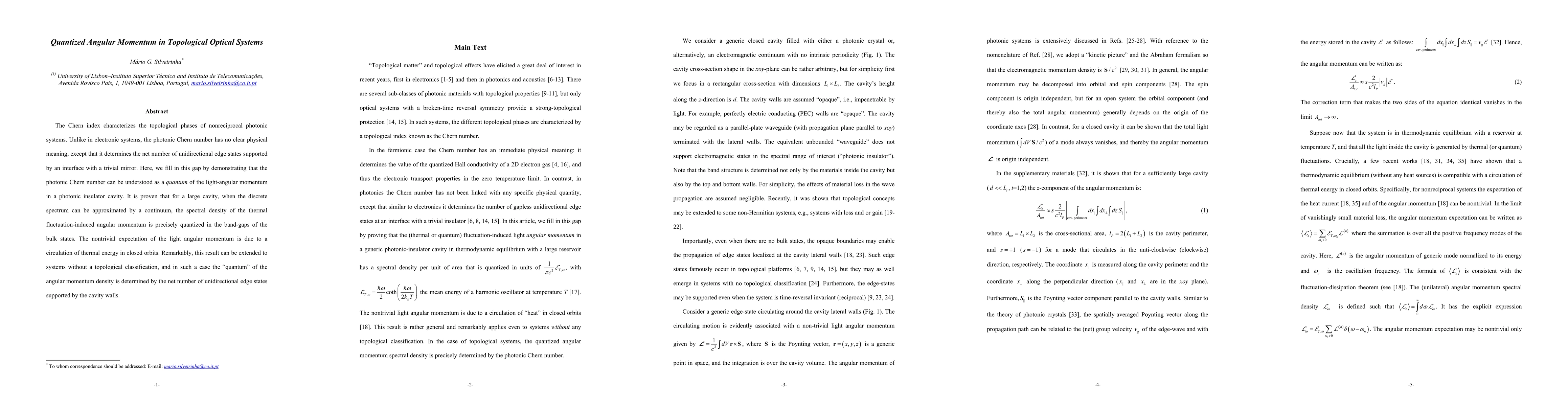 This research paper reveals that the photonic Chern number, a topological invariant in nonreciprocal photonic systems, quantizes light angular momentum in photonic insulator cavities. This quantization is due to thermal energy circulating in closed orbits within band-gaps, and applies even to systems lacking a topological classification, with the 'quantum' then determined by unidirectional edge states supported by cavity walls.
