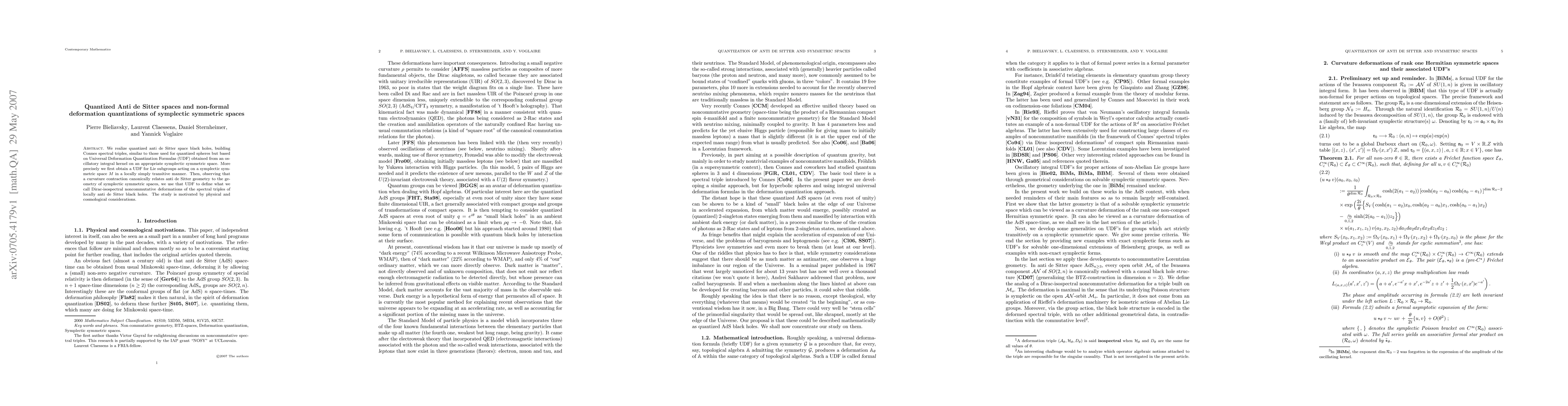 This paper constructs Connes spectral triples for quantized anti de Sitter space black holes using Universal Deformation Quantization Formulas derived from symplectic symmetric spaces. It leverages Lie subgroups and Dirac-isospectral noncommutative deformations for this purpose, motivated by physical and cosmological insights.