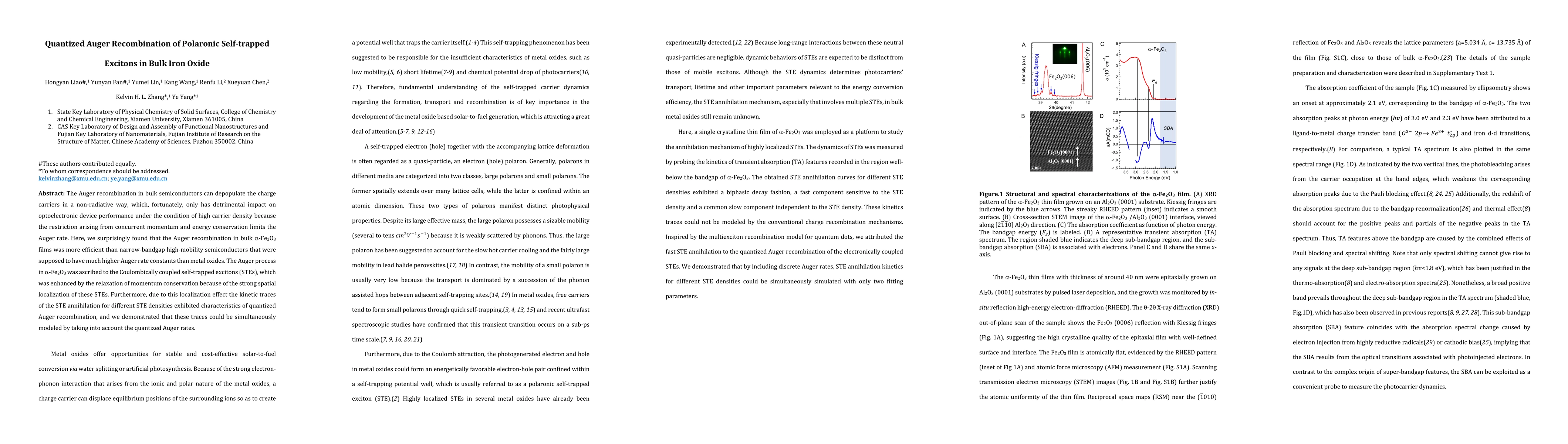 The Auger recombination in bulk semiconductors can depopulate the charge carriers in a non-radiative way, which, fortunately, only has detrimental impact on optoelectronic device performance under the condition of high carrier density because the restriction arising from concurrent momentum and energy conservation limits the Auger rate. Here, we surprisingly found that the Auger recombination in bulk Fe2O3 films was more efficient than narrow-bandgap high-mobility semiconductors that were supposed to have much higher Auger rate constants than metal oxides. The Auger process in Fe2O3 was ascribed to the Coulombically coupled self-trapped excitons (STEs), which was enhanced by the relaxation of momentum conservation because of the strong spatial localization of these STEs. Furthermore, due to this localization effect the kinetic traces of the STE annihilation for different STE densities exhibited characteristics of quantized Auger recombination, and we demonstrated that these traces could be simultaneously modeled by taking into account the quantized Auger rates.