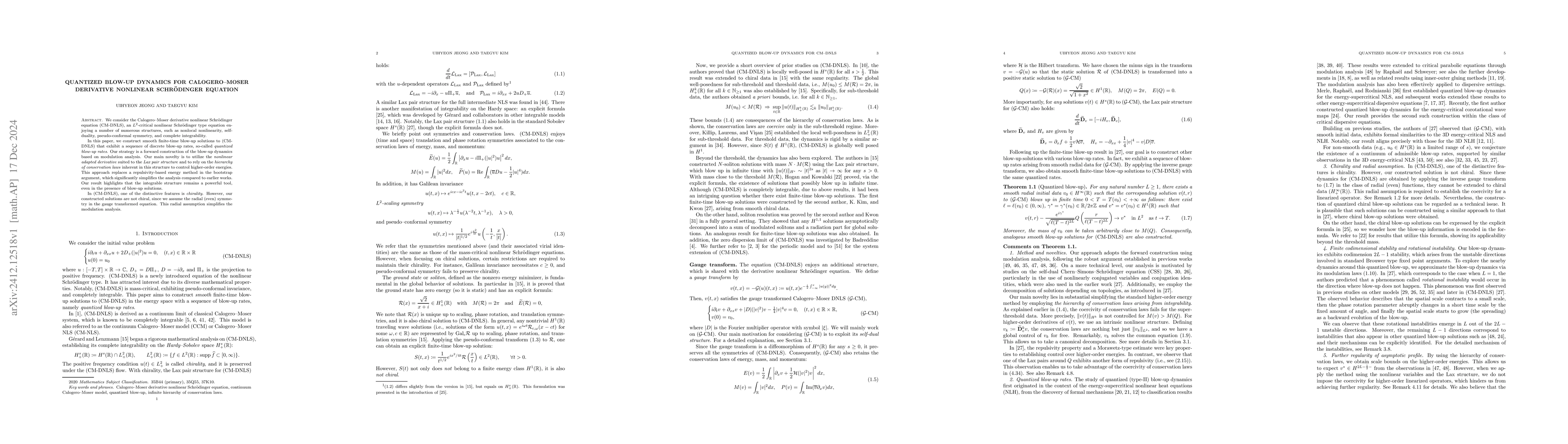 This paper constructs smooth finite-time blow-up solutions for the Calogero-Moser derivative nonlinear Schrödinger equation, revealing quantized blow-up rates. The authors employ modulation analysis and nonlinear adapted derivatives suited to the Lax pair structure to control higher-order energies, demonstrating the enduring power of integrable structures even in blow-up scenarios.