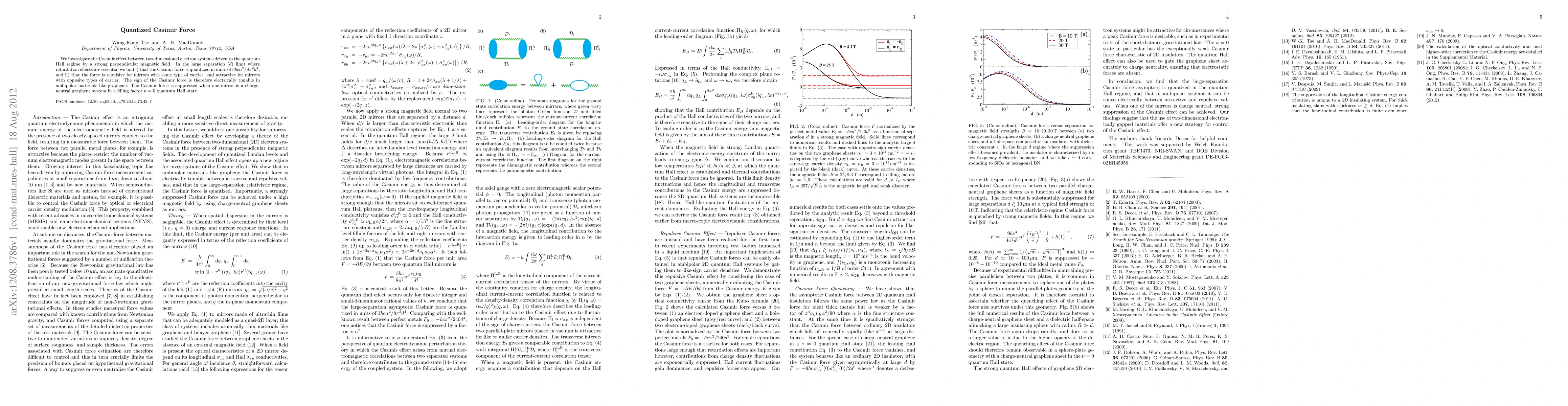 The paper presents a detailed analysis of the Casimir force in the quantum Hall regime, deriving a quantized expression for the force and demonstrating its tunability through electric fields.