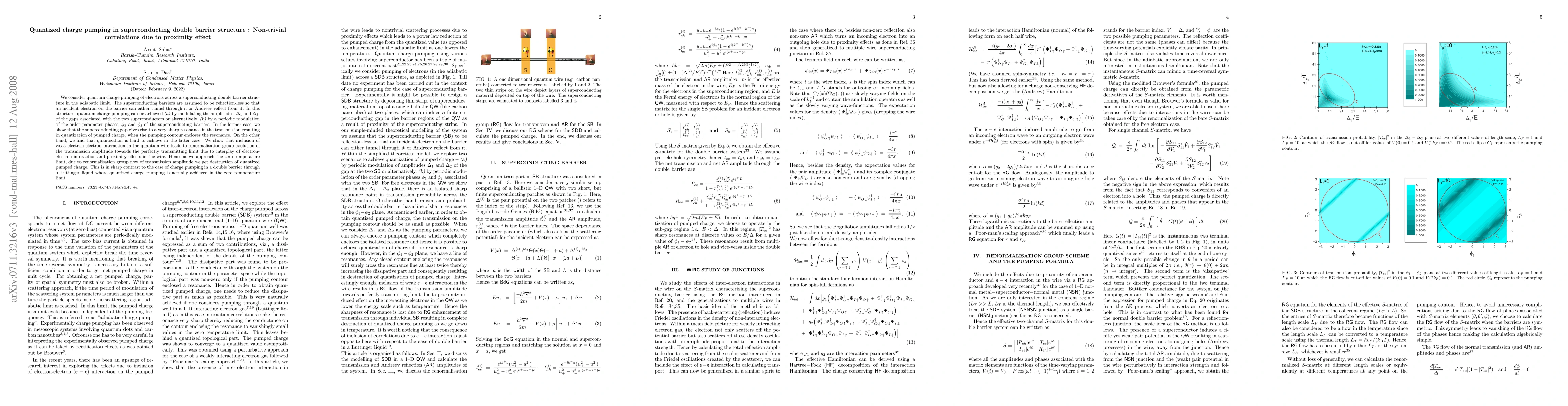 This paper investigates quantum charge pumping in a superconducting double barrier structure, demonstrating that modulation of superconducting gap amplitudes can lead to quantized charge pumping, while phase modulation struggles with this effect. Proximity effects due to weak electron-electron interactions disrupt the quantization of pumped charge, contrasting with charge pumping in Luttinger liquids.