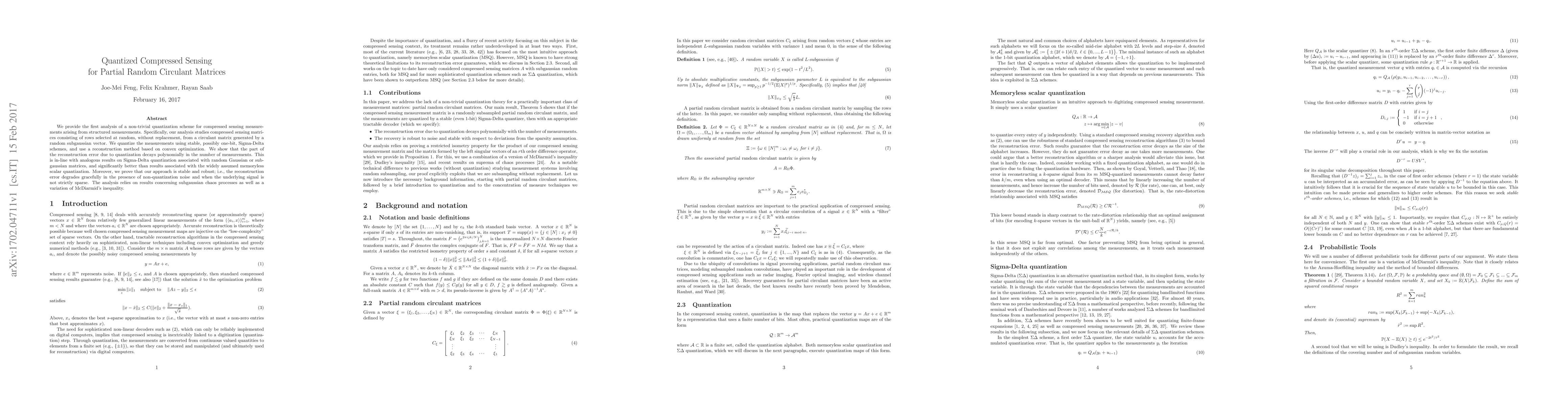 This paper analyzes a quantization scheme for compressed sensing measurements derived from structured random circulant matrices. It demonstrates that Sigma-Delta quantization, coupled with convex optimization reconstruction, results in a polynomially decaying reconstruction error, outperforming memoryless scalar quantization.