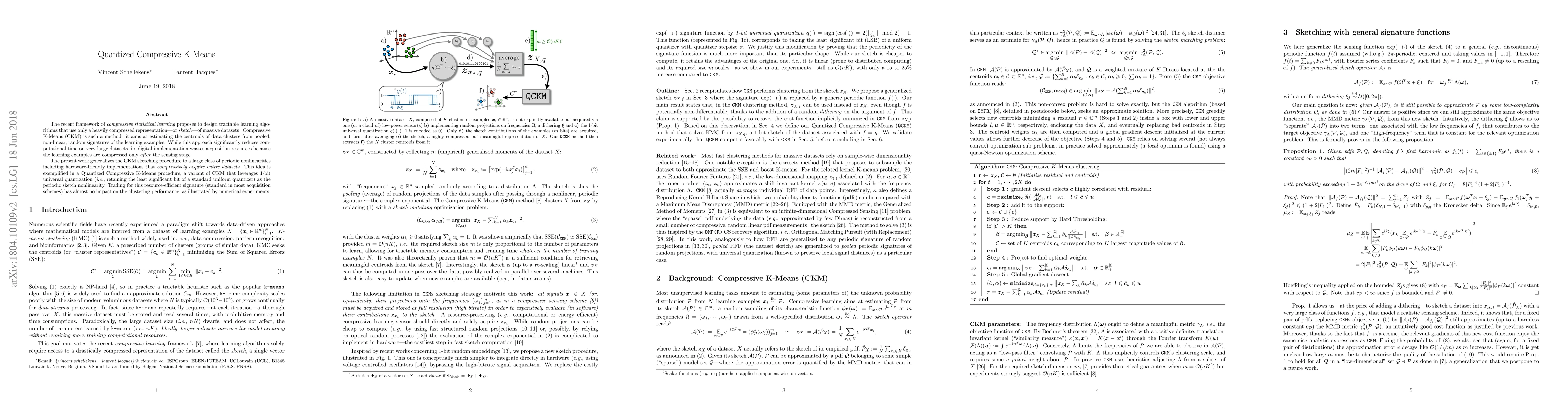 The recent framework of compressive statistical learning aims at designing tractable learning algorithms that use only a heavily compressed representation-or sketch-of massive datasets. Compressive K-Means (CKM) is such a method: it estimates the centroids of data clusters from pooled, non-linear, random signatures of the learning examples. While this approach significantly reduces computational time on very large datasets, its digital implementation wastes acquisition resources because the learning examples are compressed only after the sensing stage. The present work generalizes the sketching procedure initially defined in Compressive K-Means to a large class of periodic nonlinearities including hardware-friendly implementations that compressively acquire entire datasets. This idea is exemplified in a Quantized Compressive K-Means procedure, a variant of CKM that leverages 1-bit universal quantization (i.e. retaining the least significant bit of a standard uniform quantizer) as the periodic sketch nonlinearity. Trading for this resource-efficient signature (standard in most acquisition schemes) has almost no impact on the clustering performances, as illustrated by numerical experiments.
