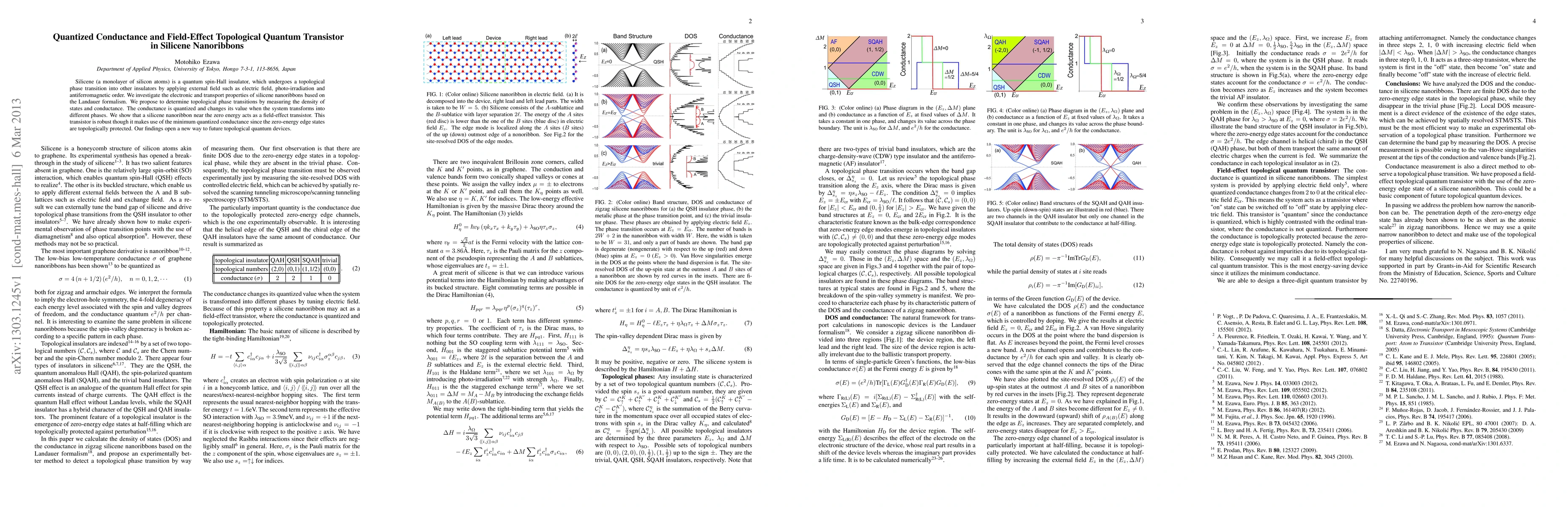 Silicene nanoribbons exhibit quantized conductance and topological phase transitions, serving as a field-effect topological quantum transistor with topologically protected zero-energy edge states. This study proposes using conductance measurements to determine phase transitions, paving the way for future topological quantum devices.