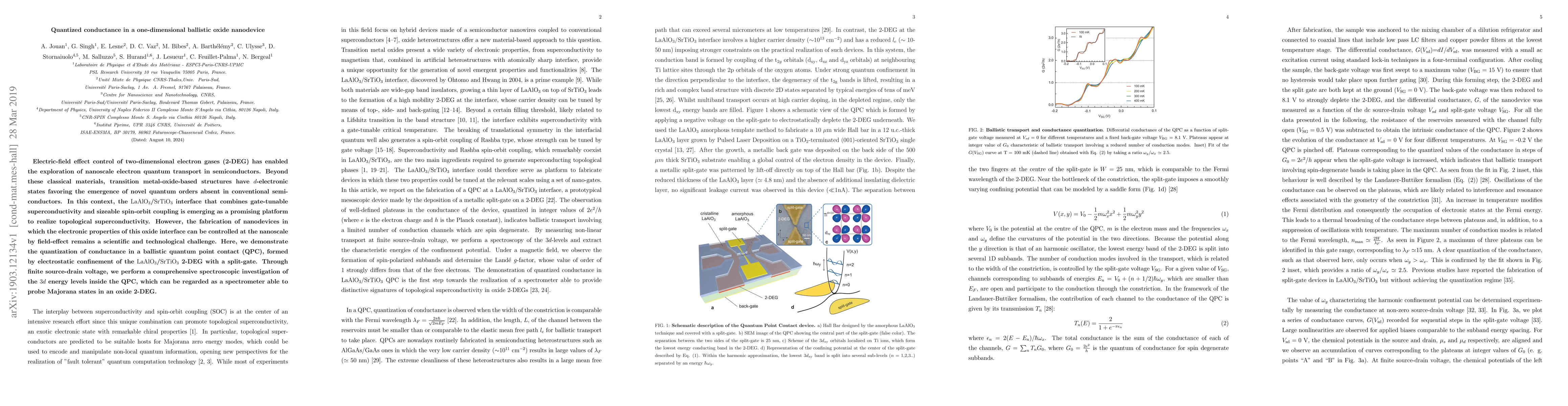 This paper demonstrates quantized conductance in a ballistic quantum point contact (QPC) formed on the LaAlO3/SrTiO3 interface, showcasing the potential for nanoscale control of electronic properties via electric field effects. The study uses spectroscopic techniques to investigate 3d energy levels, hinting at the possibility of probing Majorana states in oxide-based 2-DEGs.