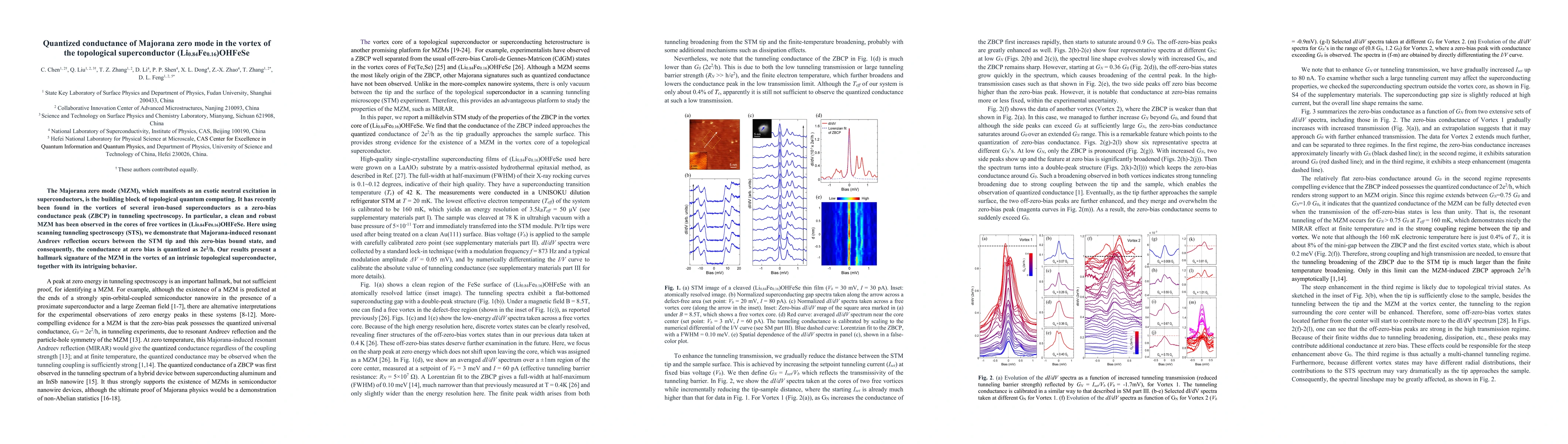 This paper reports the observation of a quantized conductance of 2e²/h in the vortex of the topological superconductor (Li₀.₈₄Fe₀.₁₆)OHFeSe, indicating the presence of a Majorana zero mode (MZM). The MZM, a neutral excitation, is crucial for topological quantum computing and was detected via scanning tunneling spectroscopy, revealing Majorana-induced resonant Andreev reflection.