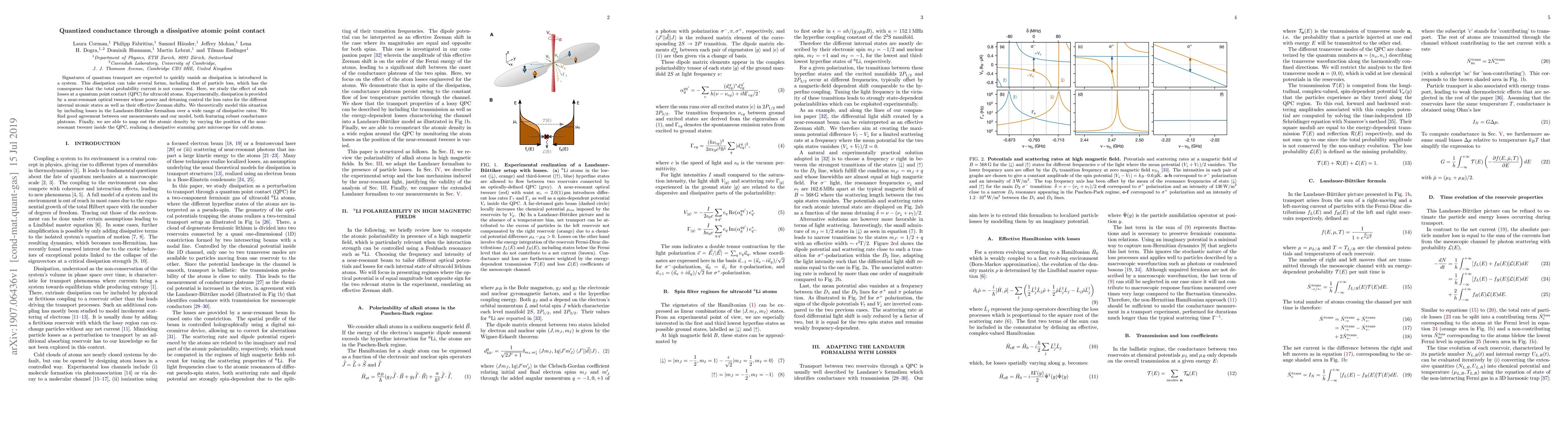 This paper investigates quantized conductance through a dissipative atomic point contact, demonstrating robust conductance plateaus despite particle loss. The study combines experimental control using a near-resonant optical tweezer and theoretical modeling within the Landauer-Büttiker formalism, achieving agreement between measurements and predictions.