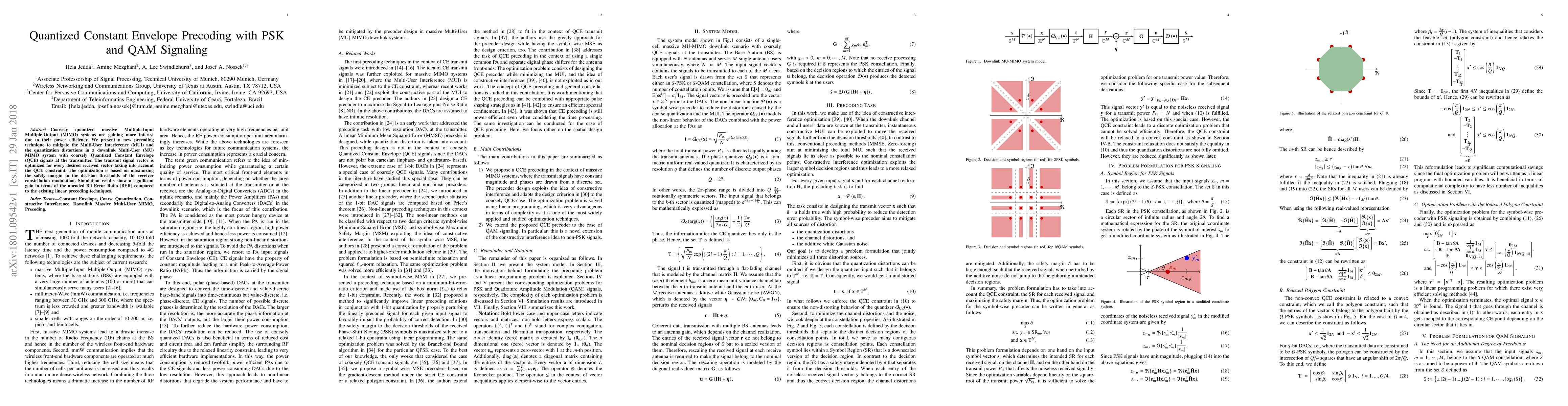 This paper introduces a new precoding technique for massive MIMO systems to reduce Multi-User Interference and quantization distortions using coarsely quantized Constant Envelope signals. The proposed method optimizes the transmit signal vector to maximize the safety margin for receiver modulation thresholds, resulting in a significant improvement in uncoded Bit Error Ratio compared to linear precoding.