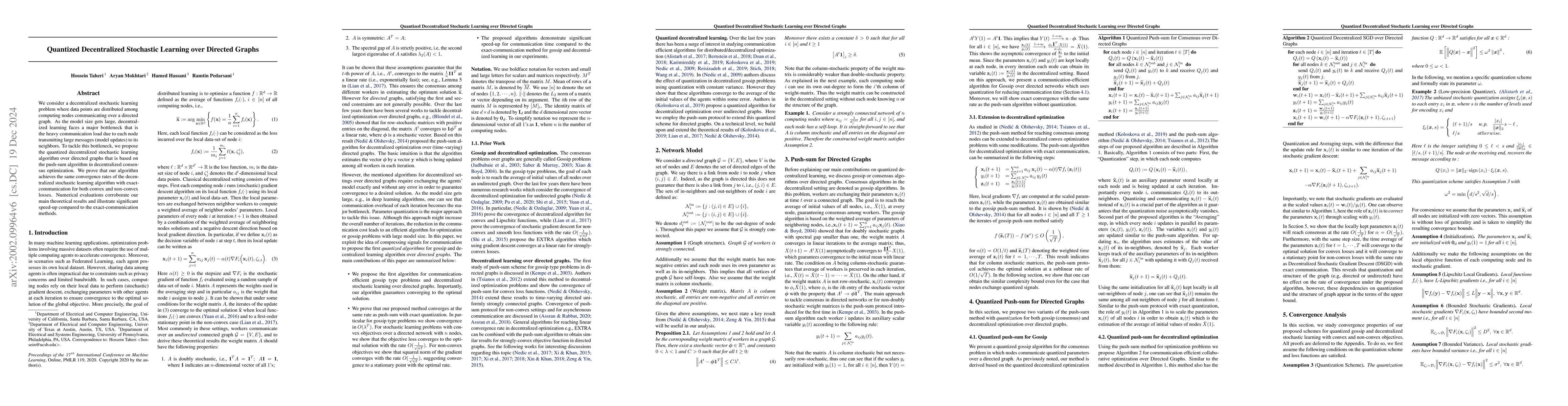 We consider a decentralized stochastic learning problem where data points are distributed among computing nodes communicating over a directed graph. As the model size gets large, decentralized learning faces a major bottleneck that is the heavy communication load due to each node transmitting large messages (model updates) to its neighbors. To tackle this bottleneck, we propose the quantized decentralized stochastic learning algorithm over directed graphs that is based on the push-sum algorithm in decentralized consensus optimization. More importantly, we prove that our algorithm achieves the same convergence rates of the decentralized stochastic learning algorithm with exact-communication for both convex and non-convex losses. Numerical evaluations corroborate our main theoretical results and illustrate significant speed-up compared to the exact-communication methods.