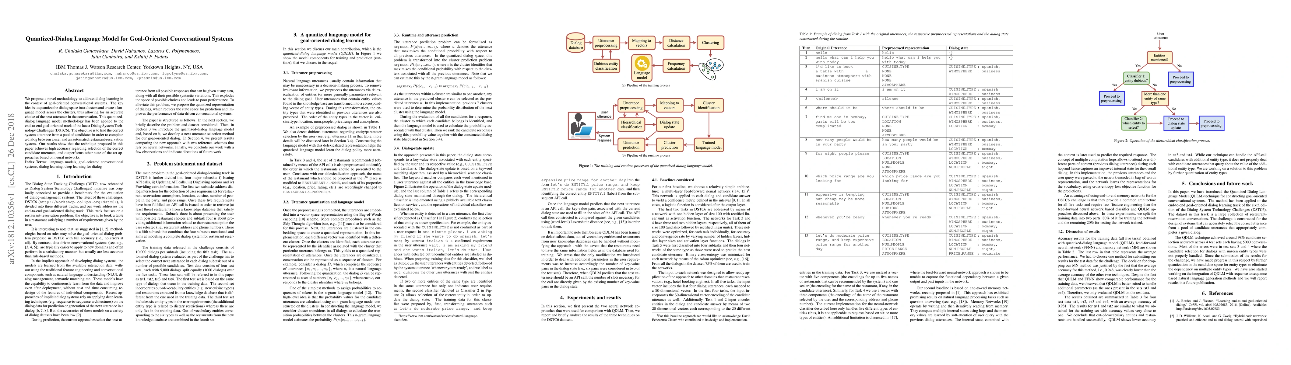 We propose a novel methodology to address dialog learning in the context of goal-oriented conversational systems. The key idea is to quantize the dialog space into clusters and create a language model across the clusters, thus allowing for an accurate choice of the next utterance in the conversation. The language model relies on n-grams associated with clusters of utterances. This quantized-dialog language model methodology has been applied to the end-to-end goal-oriented track of the latest Dialog System Technology Challenges (DSTC6). The objective is to find the correct system utterance from a pool of candidates in order to complete a dialog between a user and an automated restaurant-reservation system. Our results show that the technique proposed in this paper achieves high accuracy regarding selection of the correct candidate utterance, and outperforms other state-of-the-art approaches based on neural networks.