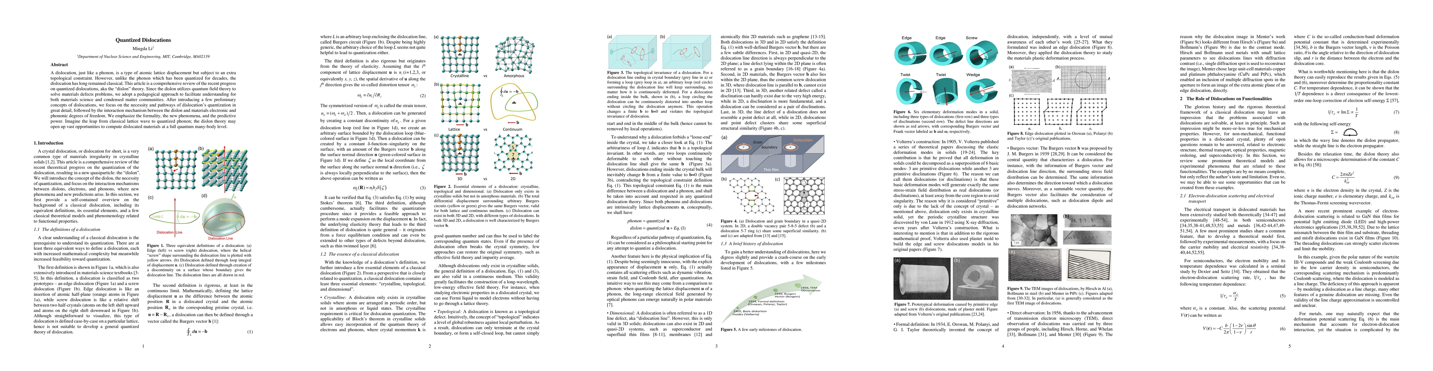 A dislocation, just like a phonon, is a type of atomic lattice displacement but subject to an extra topological constraint. However, unlike the phonon which has been quantized for decades, the dislocation has long remained classical. This article is a comprehensive review of the recent progress on quantized dislocations, aka the "dislon" theory. Since the dislon utilizes quantum field theory to solve materials defects problems, we adopt a pedagogical approach to facilitate understanding for both materials science and condensed matter communities. After introducing a few preliminary concepts of dislocations, we focus on the necessity and pathways of dislocation's quantization in great detail, followed by the interaction mechanism between the dislon and materials electronic and phononic degrees of freedom. We emphasize the formality, the new phenomena, and the predictive power. Imagine the leap from classical lattice wave to quantized phonon; the dislon theory may open up vast opportunities to compute dislocated materials at a full quantum many-body level.