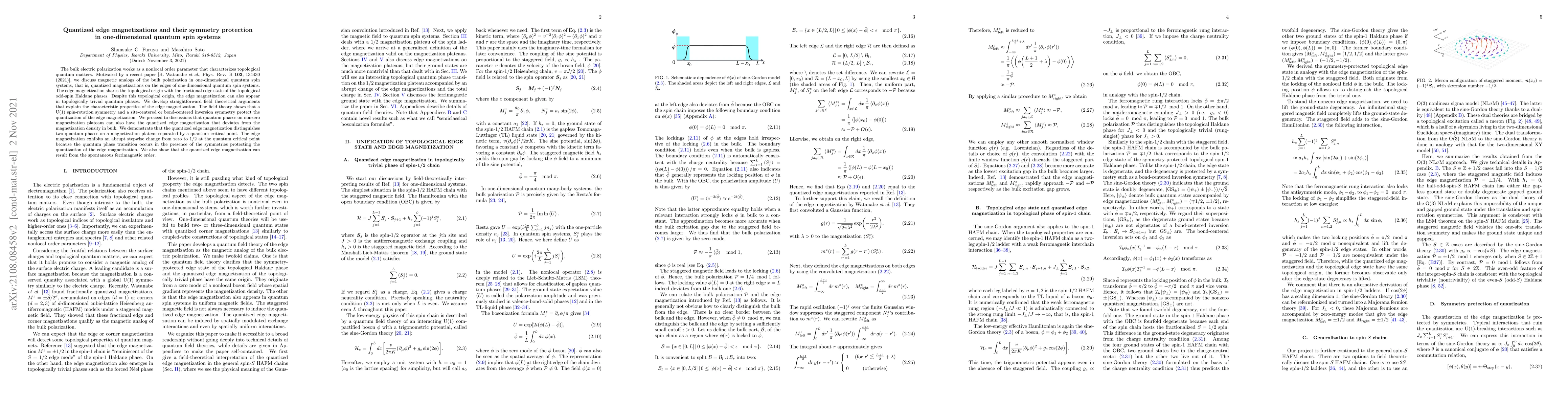 The bulk electric polarization works as a nonlocal order parameter that characterizes topological quantum matters. Motivated by a recent paper [H. Watanabe \textit{et al.}, Phys. Rev. B {\bf 103}, 134430 (2021)], we discuss magnetic analogs of the bulk polarization in one-dimensional quantum spin systems, that is, quantized magnetizations on the edges of one-dimensional quantum spin systems.The edge magnetization shares the topological origin with the fractional edge state of the topological odd-spin Haldane phases. Despite this topological origin, the edge magnetization can also appear in topologically trivial quantum phases. We develop straightforward field theoretical arguments that explain the characteristic properties of the edge magnetization. The field theory shows that a U(1) spin-rotation symmetry and a site-centered or bond-centered inversion symmetry protect the quantization of the edge magnetization. We proceed to discussions that quantum phases on nonzero magnetization plateaus can also have the quantized edge magnetization that deviates from the magnetization density in bulk. We demonstrate that the quantized edge magnetization distinguishes two quantum phases on a magnetization plateau separated by a quantum critical point. The edge magnetization exhibits an abrupt stepwise change from zero to $1/2$ at the quantum critical point because the quantum phase transition occurs in the presence of the symmetries protecting the quantization of the edge magnetization. We also show that the quantized edge magnetization can result from the spontaneous ferrimagnetic order.