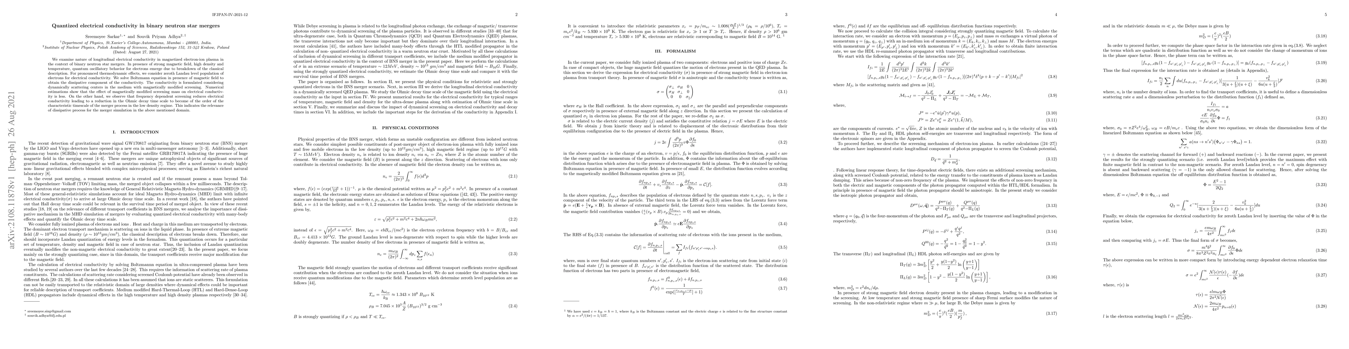 This paper investigates the quantized electrical conductivity in magnetized electron-ion plasma during binary neutron star mergers, revealing quantum oscillatory behavior due to strong magnetic fields. The study shows that frequency-dependent screening significantly reduces electrical conductivity, leading to a shorter Ohmic decay time scale relevant to the merger process.