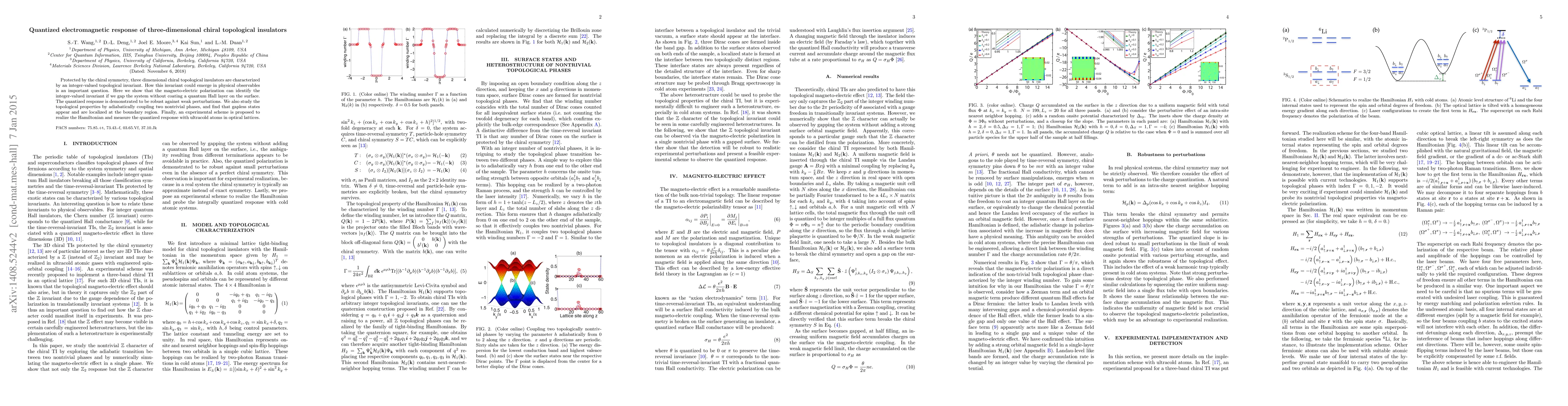 This paper demonstrates that three-dimensional chiral topological insulators exhibit quantized magneto-electric polarization, identifying their integer-valued topological invariant without requiring a quantum Hall layer. The study shows the robustness of this quantized response against weak perturbations and proposes an experimental setup using ultracold atoms in optical lattices to realize and measure this effect.