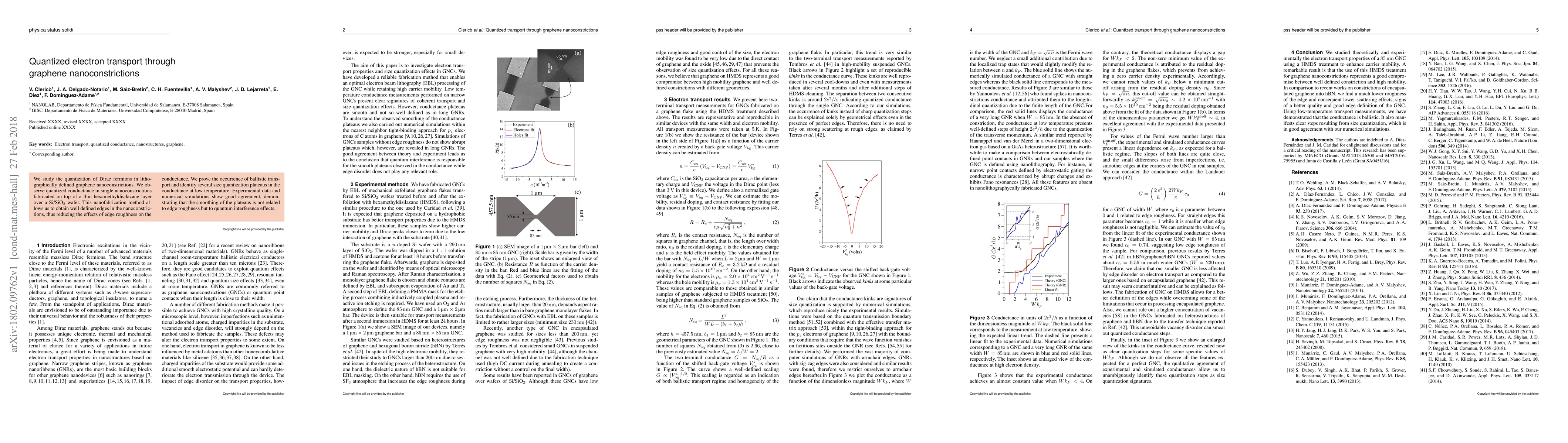 This study investigates quantized electron transport in graphene nanoconstrictions, revealing quantized conductance plateaus at low temperatures due to ballistic transport. The nanofabrication technique employed produces well-defined edges, confirming that conductance plateaus are primarily due to quantum interference rather than edge roughness.