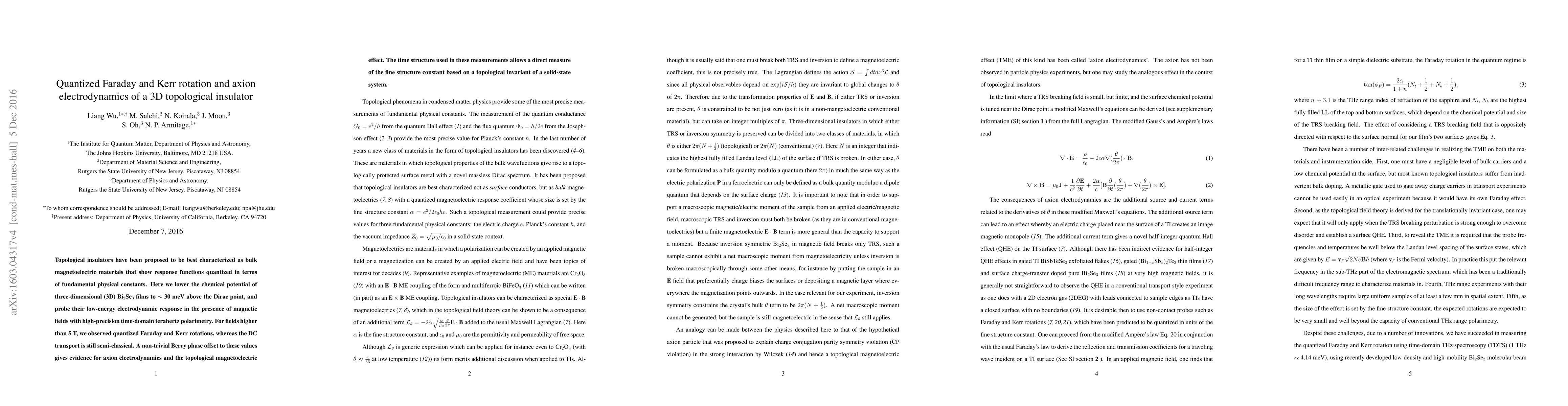 This paper investigates the quantized Faraday and Kerr rotations in 3D topological insulator Bi$_2$Se$_3$ films, revealing quantized responses linked to fundamental physical constants. The study finds evidence for axion electrodynamics and topological magnetoelectric effects, with the time-domain measurements enabling a direct measure of the fine structure constant.