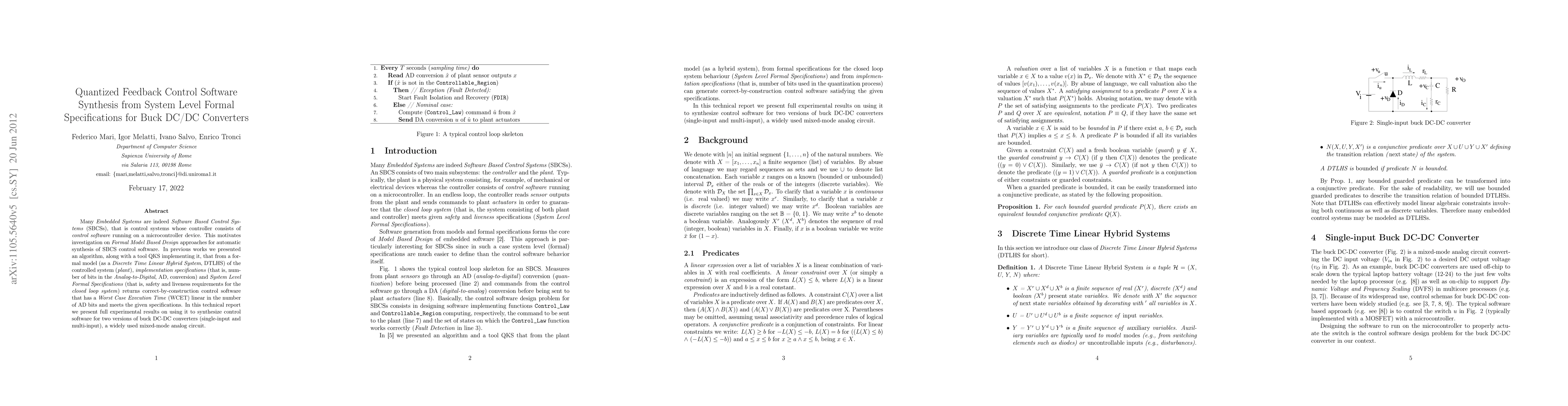 Many Embedded Systems are indeed Software Based Control Systems (SBCSs), that is control systems whose controller consists of control software running on a microcontroller device. This motivates investigation on Formal Model Based Design approaches for automatic synthesis of SBCS control software. In previous works we presented an algorithm, along with a tool QKS implementing it, that from a formal model (as a Discrete Time Linear Hybrid System, DTLHS) of the controlled system (plant), implementation specifications (that is, number of bits in the Analog-to-Digital, AD, conversion) and System Level Formal Specifications (that is, safety and liveness requirements for the closed loop system) returns correct-by-construction control software that has a Worst Case Execution Time (WCET) linear in the number of AD bits and meets the given specifications. In this technical report we present full experimental results on using it to synthesize control software for two versions of buck DC-DC converters (single-input and multi-input), a widely used mixed-mode analog circuit.
