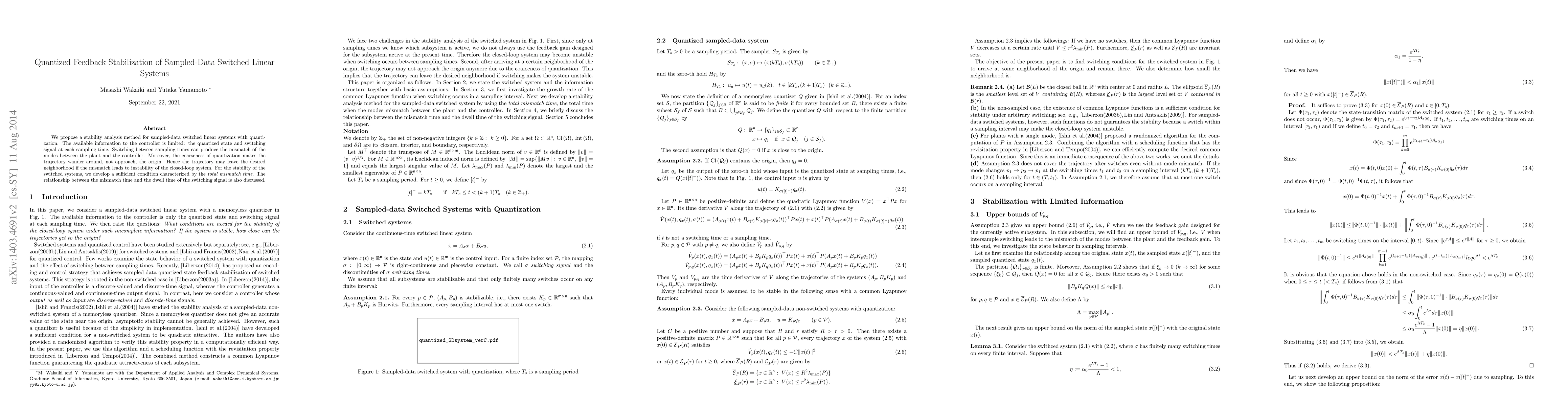 This paper proposes a stability analysis method for sampled-data switched linear systems with quantization, addressing the challenges of mode mismatch and trajectory wandering due to limited controller information. It develops a sufficient stability condition based on the total mismatch time and discusses its relationship with the switching signal's dwell time.