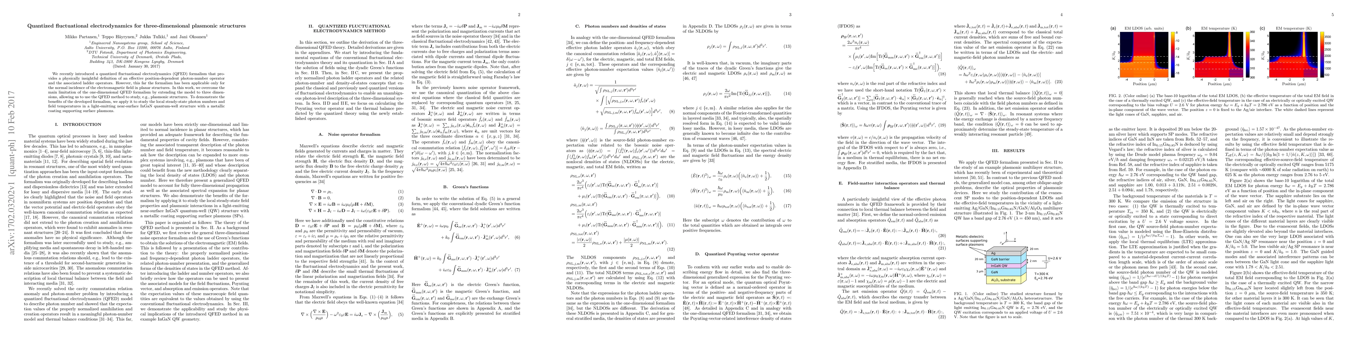 We recently introduced a quantized fluctuational electrodynamics (QFED) formalism that provides a physically insightful definition of an effective position-dependent photon-number operator and the associated ladder operators. However, this far the formalism has been applicable only for the normal incidence of the electromagnetic field in planar structures. In this work, we overcome the main limitation of the one-dimensional QFED formalism by extending the model to three dimensions, allowing us to use the QFED method to study, e.g., plasmonic structures. To demonstrate the benefits of the developed formalism, we apply it to study the local steady-state photon numbers and field temperatures in a light-emitting near-surface InGaN quantum-well structure with a metallic coating supporting surface plasmons.