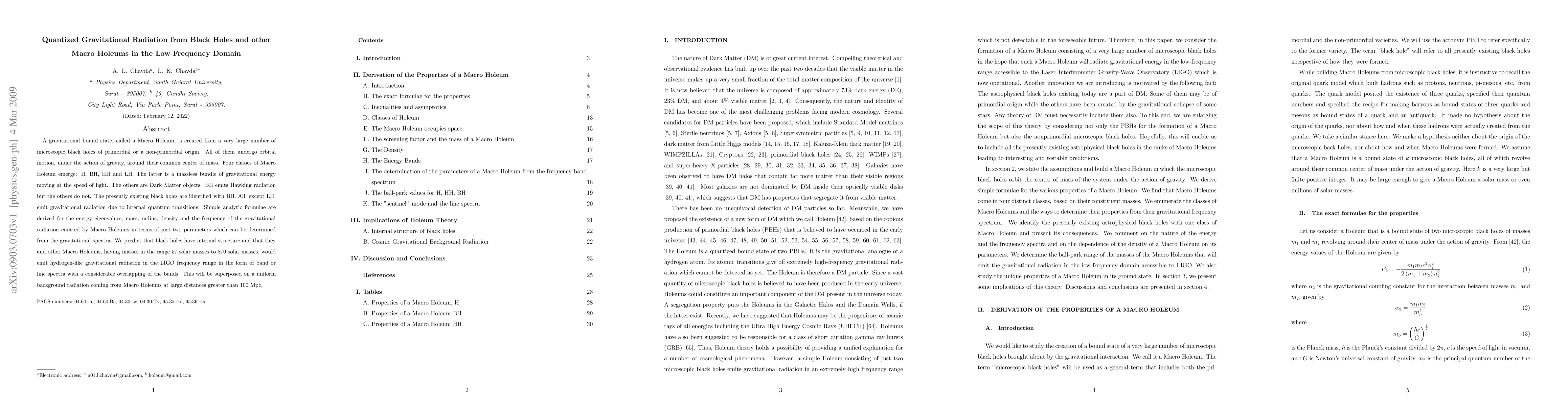 A gravitational bound state, called a Macro Holeum, is created from a very large number of microscopic black holes of primordial or a non-primordial origin. All of them undergo orbital motion, under the action of gravity, around their common center of mass. Four classes of Macro Holeum emerge: H, BH, HH and LH. The latter is a massless bundle of gravitational energy moving at the speed of light. The others are Dark Matter objects. BH emits Hawking radiation but the others do not. The presently existing black holes are identified with BH. All, except LH, emit gravitational radiation due to internal quantum transitions. Simple analytic formulae are derived for the energy eigenvalues, mass, radius, density and the frequency of the gravitational radiation emitted by Macro Holeums in terms of just two parameters which can be determined from the gravitational spectra. We predict that black holes have internal structure and that they and other Macro Holeums, having masses in the range 57 solar masses to 870 solar masses, would emit hydrogen-like gravitational radiation in the LIGO frequency range in the form of band or line spectra with a considerable overlapping of the bands. This will be superposed on a uniform background radiation coming from Macro Holeums at large distances greater than 100 Mpc. 04.60.-m, 04.60.Bc, 04.30.-w, 04.30.Tv, 95.35.+d, 95.36.+x